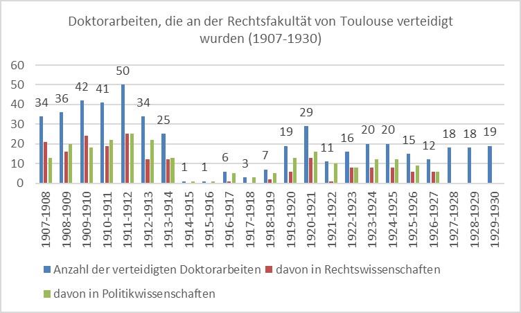 Die erste Auswirkung des Krieges auf die Produktion der Dissertationen an der juristischen Fakultät von Toulouse zeigte sich zunächst an der Zahl der Thesen, die seit 1914 drastisch abnahmen. In den Vorkriegsjahren wurden regelmäßig dreißig bis vierzig Doktorarbeiten jährlich verteidigt, und obwohl das Jahr 1911 mit seinen 50 Thesen den Beginn einer Abschwächung markierte (sowohl aufgrund einer Änderung der Bedingungen für die Vergabe des Doktorats in Toulouse im Jahr 1911 als auch eines allgemeinen Rückgangs der Zahl der Studenten in allen Fakultäten des Südens, die von der Konkurrenz von Limoges und Clermont-Ferrand ab 1909 betroffen waren), kannten die beiden Jahre vor dem Krieg noch 34 bzw. 25 Doktoranden.