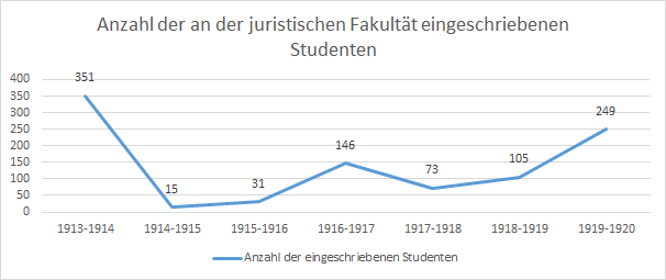 Im Jahr 1918 betrug die Zahl der Studenten der juristischen Fakultät auf 105. Zahlreiche junge Männer sind noch mobilisiert, und die Fortbewegung, wenn auch erlaubt, ist immer noch gestört, was der Besuch der Universität für Nicht-Bewohner der Metropole nicht einfach macht. Es braucht Zeit, bis die Fakultät ihr Vorkriegsniveau wiedererlangt: Im Jahr 1919‑1920 sind nur 249 Studenten eingeschrieben, im Vergleich zu 351 im Jahr 1913‑1914.
