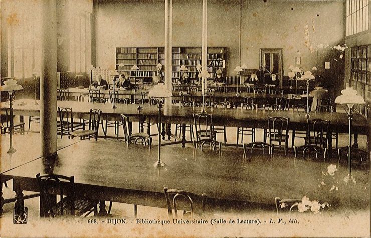 So werden in Dijon und nicht anderswo zwei amerikanische Bibliotheksbeispiele für die Studenten im Jahr 1919 beobachtet: die kleine Bibliothek mit 2000 Bänden, die von Miss Goddard im YMCA Inn, in der 27 rue Sambin, verwaltet wird, die ausschließlich für amerikanische Studenten reserviert ist. Vor allem jedoch die Bibliothek der A.E.F.U. (American Expeditionary Force University), die in Rekordzeit mit aller Macht der amerikanischen Maschinerie in Beaune eingerichtet wurde und 30.000 Bände umfasst, insgesamt 90.000 Ausleihen… in nur vier Monaten Bestehen.