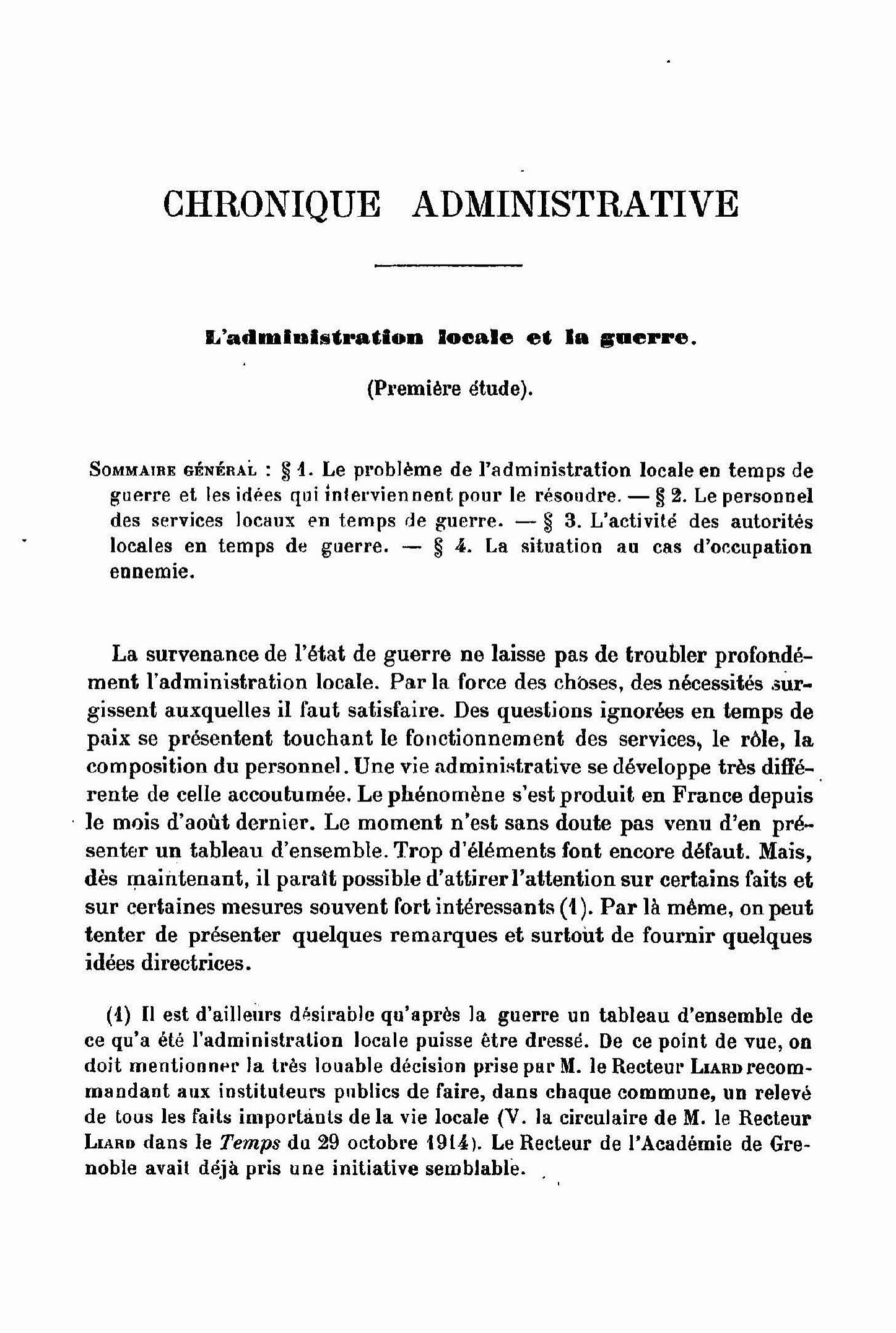 Louis Rolland, Professor für Verwaltungsrecht an der Universität Nancy, nimmt dieser allgemeinen pädagogischen Bewegung teil , die es versucht, die die Veränderungen, die den Recht anlässlich dem Krieg erlebt zu erklären. Mit dieser dreiteiligen Chronik, die in der Revue de droit public veröffentlicht wurde, richtet sich Rolland an die aktive Verwaltung.