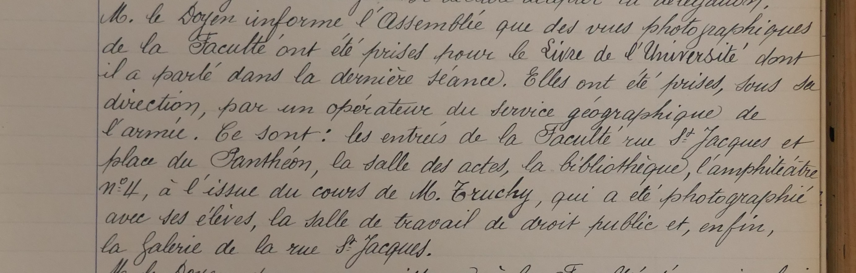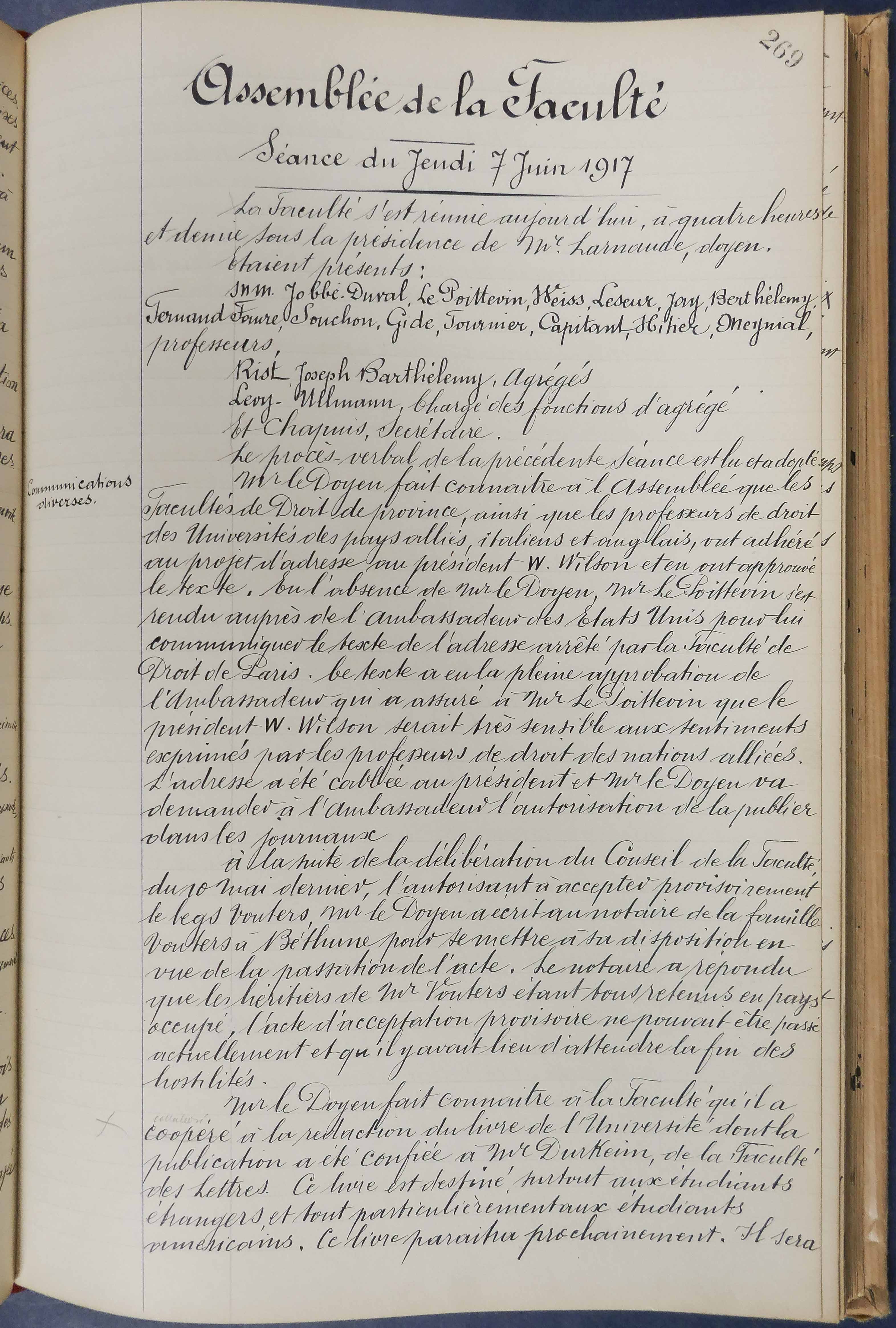 Transcription : « Assemblée de la FacultéSéance du jeudi 7 juin 1917La Faculté s'est réunie aujourd'hui, à quatre heures et demie sous la présidence de Me Larnaude, doyen.Étaient présents :MM. Jobbé-Duval, Le Poittevin, Weiss, Leseur, Jay, Berthélemy, Fernand Faure, Souchon, Fournier, Capitant, Hitier, Meynial, professeurs,Rist, Joseph Barthélemy, agrégésLévy-Ullmann, chargé des fonctions d'agrégéEt Chapuis, secrétaire.Le procès-verbal de la précédente séance est lu et adopté.Communications diverses Mr le Doyen fait connaitre à l'Assemblée que les Facultés de Droit de province, ainsi que les professeurs de droit des Universités des pays alliés, italiens et anglais, ont adhéré au projet d'adresse au président W. Wilson et ont approuvé le texte. En l'absence de Mr le Doyen, Mr Le Poittevin s'est rendu auprès de l'ambassadeur des États-Unis pour lui communiquer le texte de l'adresse arrêté par la Faculté de Droit de Paris. Le texte a eu la pleine approbation de l'Ambassadeur qui a assuré à Mr Le Poittevin que le président W. Wilson serait très sensible aux sentiments exprimés par les professeurs de droit des nations alliées. L'adresse a été cablée au président et Mr le Doyen va demander à l'Ambassadeur l'autorisation de la publier dans les journaux. »