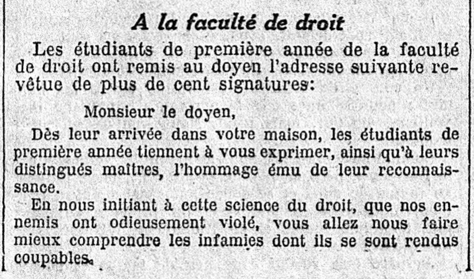 <strong>The register of deliberations of the assembly and the faculty board transcribed Dean Hauriou's entire speech. He drew up an initial assessment and intended to show his students the way forward, calling for a "moral order".</strong>