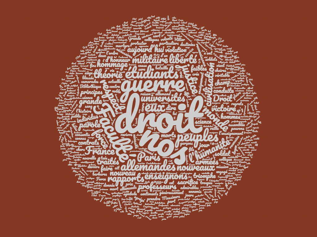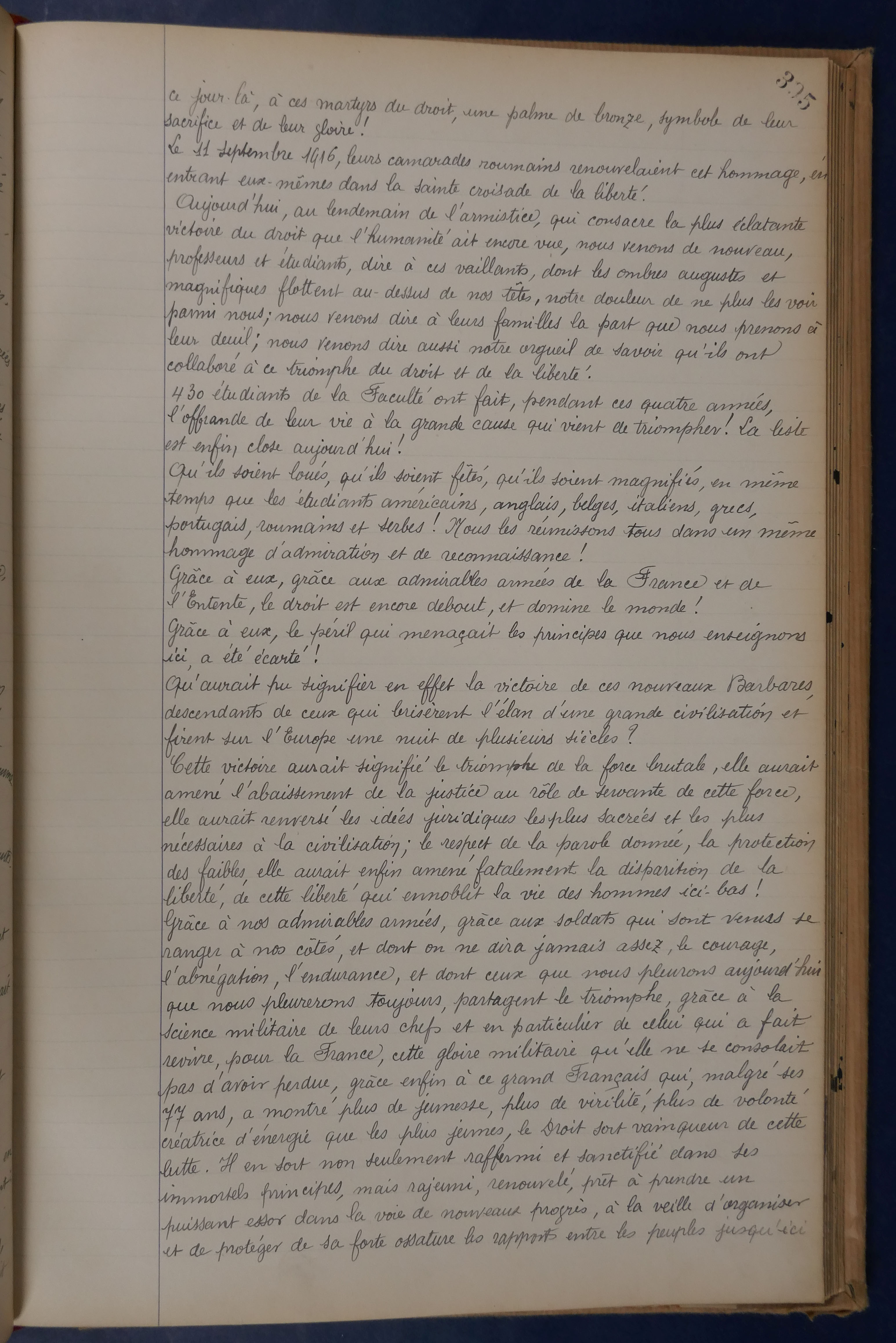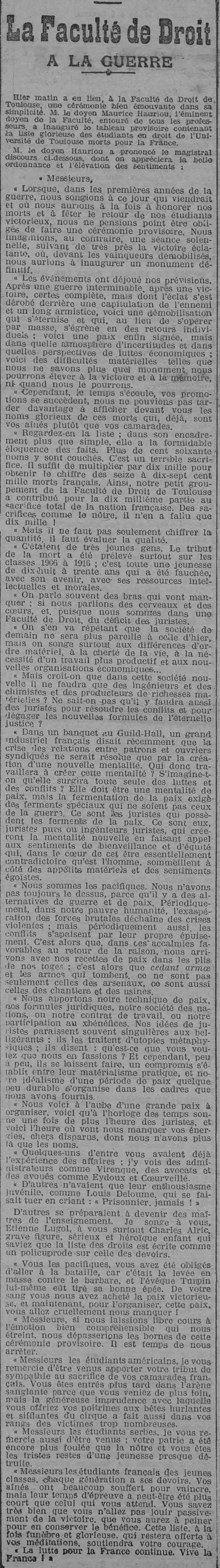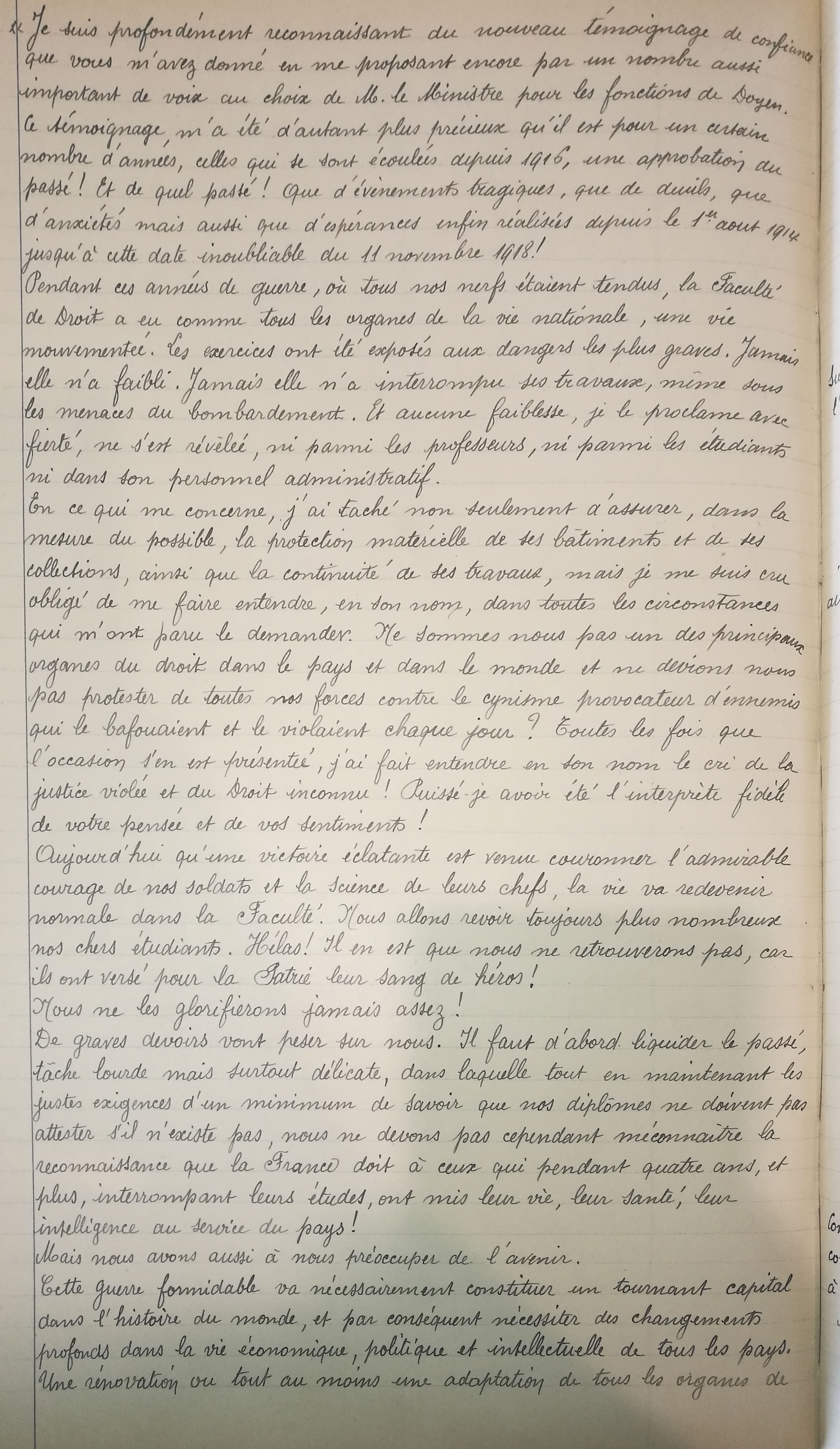Transcription : « […] ce jour-là, à ces martyrs du droit, une palme de bronze, symbole de leur sacrifice et de leur gloire ! Le 11 septembre 1916, leurs camarades roumains renouvelaient cet hommage, en entrant eux-mêmes dans la sainte croisade de la liberté. Aujourd'hui, au lendemain de l'armistice, qui consacre la plus éclatante victoire du droit que l'humanité ait encore vue, nous venons de nouveau, professeurs et étudiants, dire à ces vaillants, dont les ombres augustes et magnifiques flottent au-dessus de nos têtes, notre douleur de ne plus les voir parmi nous ; nous venons dire à leur familles la part que nous prenons à leur deuil ; nous venons dire aussi notre orgueil de savoir qu'ils ont collaboré à ce triomphe du droit et de la liberté. 430 étudiants de la faculté ont fait, pendant ces quatre années, l'offrande de leur vie à la grande cause qui vient de triompher ! La liste est enfin close aujourd’hui ! Qu'ils soient loués, qu'ils soient fêtés, qu'ils soient magnifiés, en même temps que les étudiants américains, anglais, belges, italiens, grecs, portugais, roumains et serbes ! Nous les réunissons tous dans un même hommage d'admiration et de reconnaissance ! Grâce à eux, grâce aux admirables armées de la France et de l'Entente, le droit est encore debout, et il domine le monde ! Grâce à eux, le péril qui menaçait les principes que nous enseignons ici, a été écarté ! Qu'aurait pu signifier en effet la victoire de ces nouveaux Barbares, descendants de ceux qui brisèrent l'élan d'une grande civilisation et firent sur l'Europe une nuit de plusieurs siècles ? Cette victoire aurait signifié le triomphe de la force brutale, elle aurait amené l'abaissement de la justice au rôle de servante de cette force, elle aurait renversé les idées juridiques les plus sacrées et les plus nécessaires à la civilisation ; le respect de la parole donnée, la protection des faibles, elle aurait enfin amené fatalement la disparition de la liberté, de cette liberté qui ennoblit la vie des hommes ici-bas ! Grâce à nos admirables armées, grâce aux soldats qui sont venus se ranger à nos côtés, et dont on ne dira jamais assez le courage, l'abnégation, l'endurance, et dont ceux que nous pleurons aujourd'hui que nous pleurerons toujours, partagent le triomphe, grâce à la science militaire de leurs chefs et en particulier de celui qui a fait revivre, pour la France, cette gloire militaire qu'elle ne se consolait pas d'avoir perdue, grâce enfin à ce grand Français qui, malgré ses 77 ans, a montré plus de jeunesse, plus de virilité, plus de volonté créatrice d'énergie que les plus jeunes, le Droit sort vainqueur de cette lutte. Il en sort non seulement raffermi et sanctifié dans ses immortels principes, mais rajeuni, renouvelé, prêt à prendre un puissant essor dans la voie de nouveaux progrès, à la veille d'organiser et de protéger de sa forte ossature les rapports entre les peuples jusqu’ici […] »