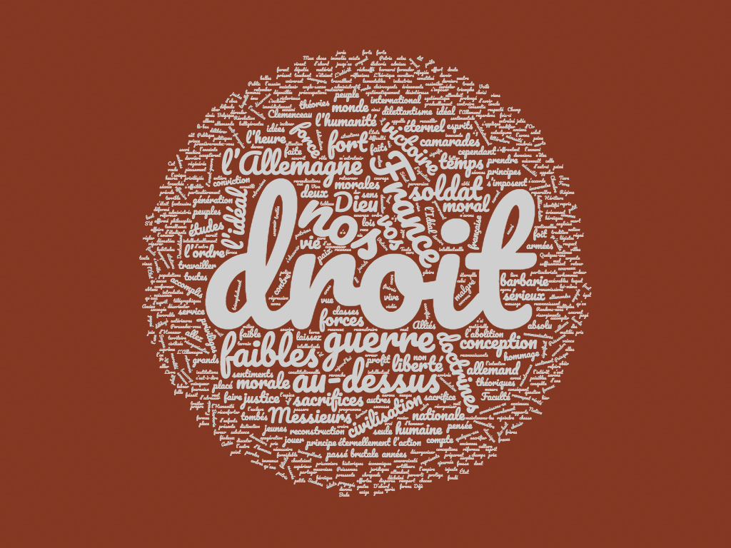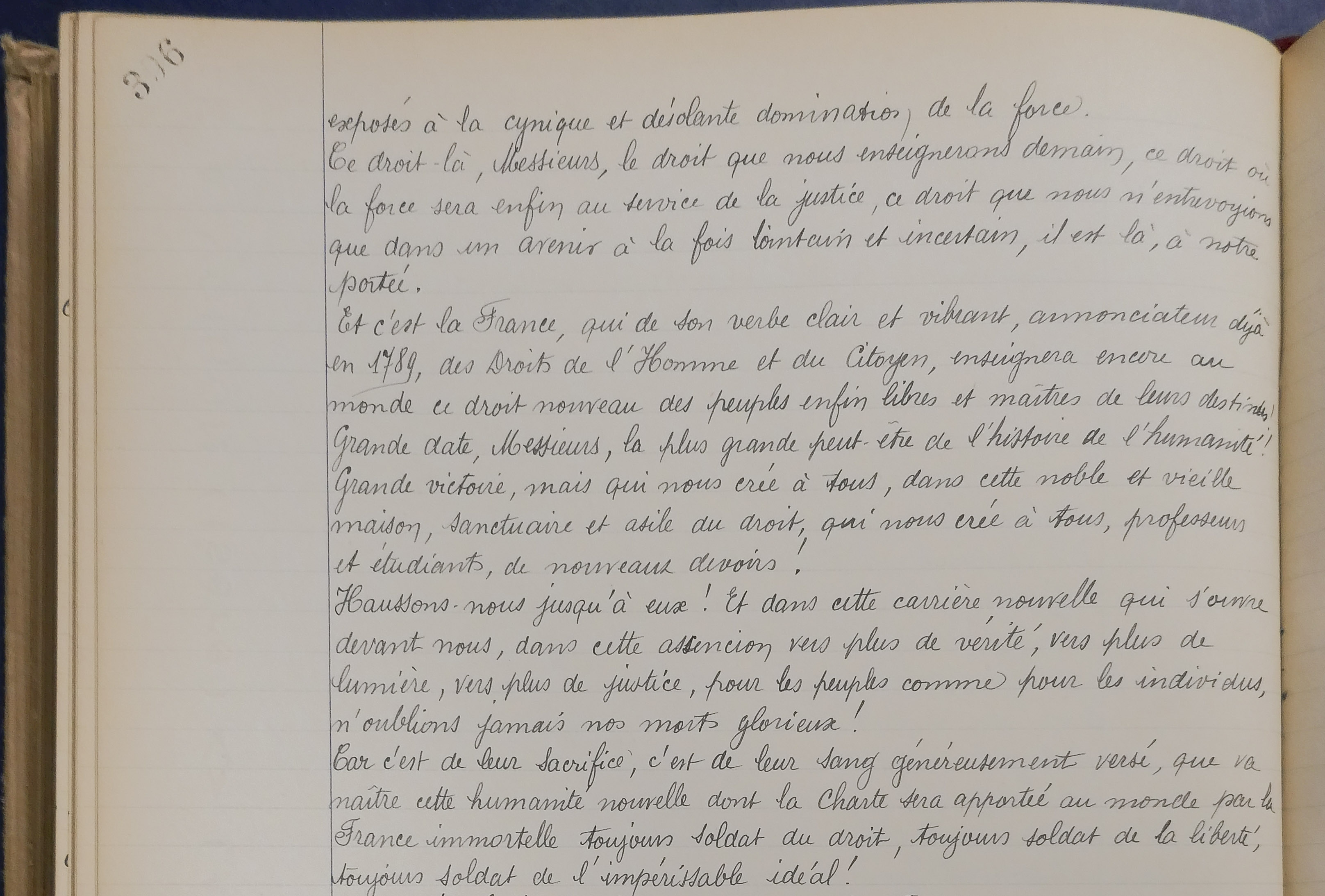 Transcription : « […] exposés à la cynique et désolante domination de la force.Ce droit-là, Messieurs, le droit que nous enseignerons demain, ce droit où la force sera enfin au service de la justice, ce droit que nous n'entrevoyions que dans un avenir à la fois lointain et incertain, il est là, à notre portée.