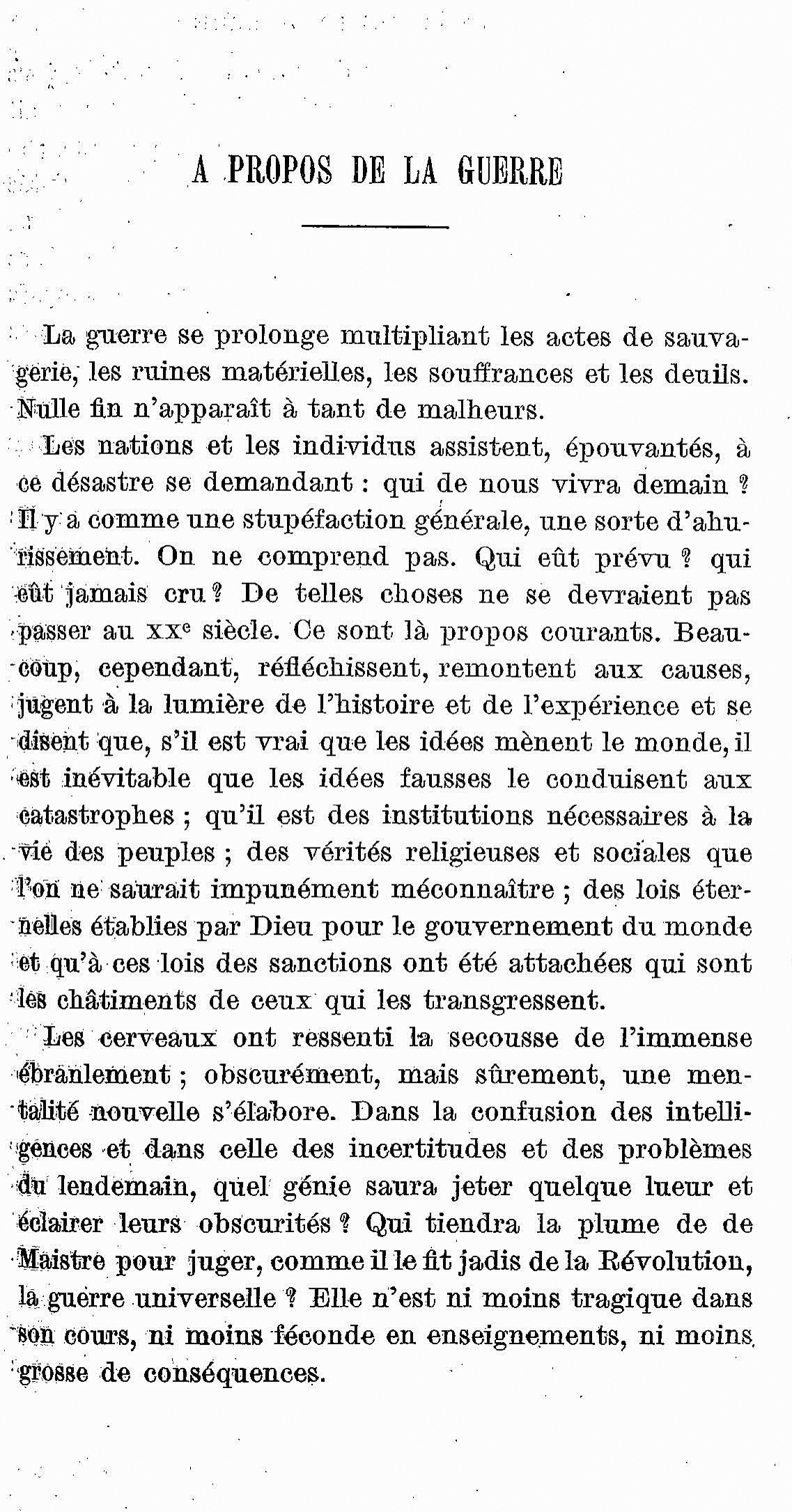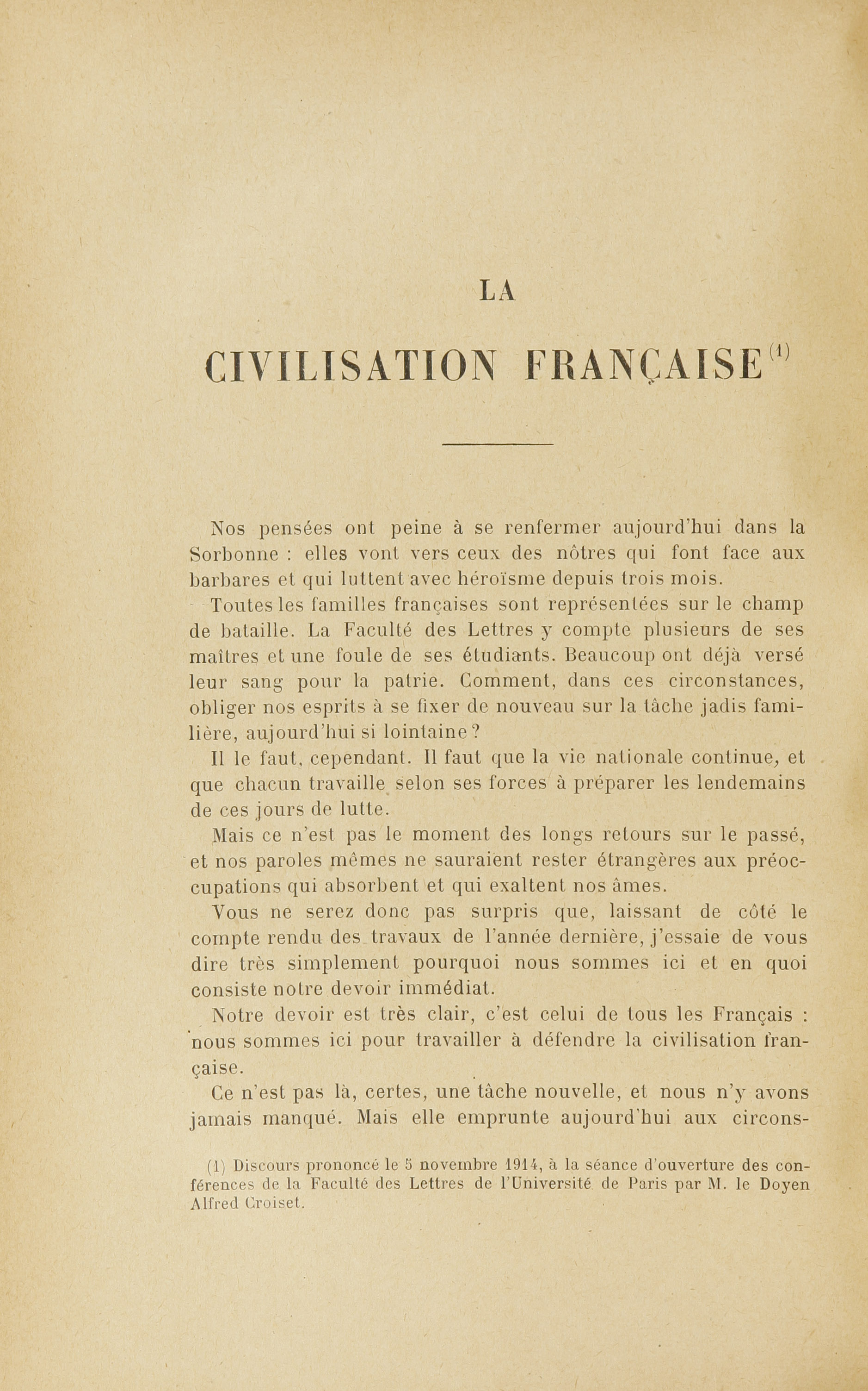 However, Charles Jacquier's interventions differed from those of Ferdinand Larnaude and Maurice Hauriou: while they drew on elements of the War of Law, they also provided an opportunity for the dean to promote a Catholic and conservative vision of society and civilization that resonated particularly strongly at that time. His December 1915 lecture on La famille et la patrie (The Family and the Fatherland), reproduced here, is one example.