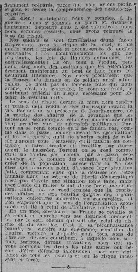 Grâce à eux, grâce aux admirables armées de la France et de l'Entente, le droit est encore debout, et il domine le monde ! Grâce à eux, le péril qui menaçait les principes que nous enseignons ici, a été écarté !</br>