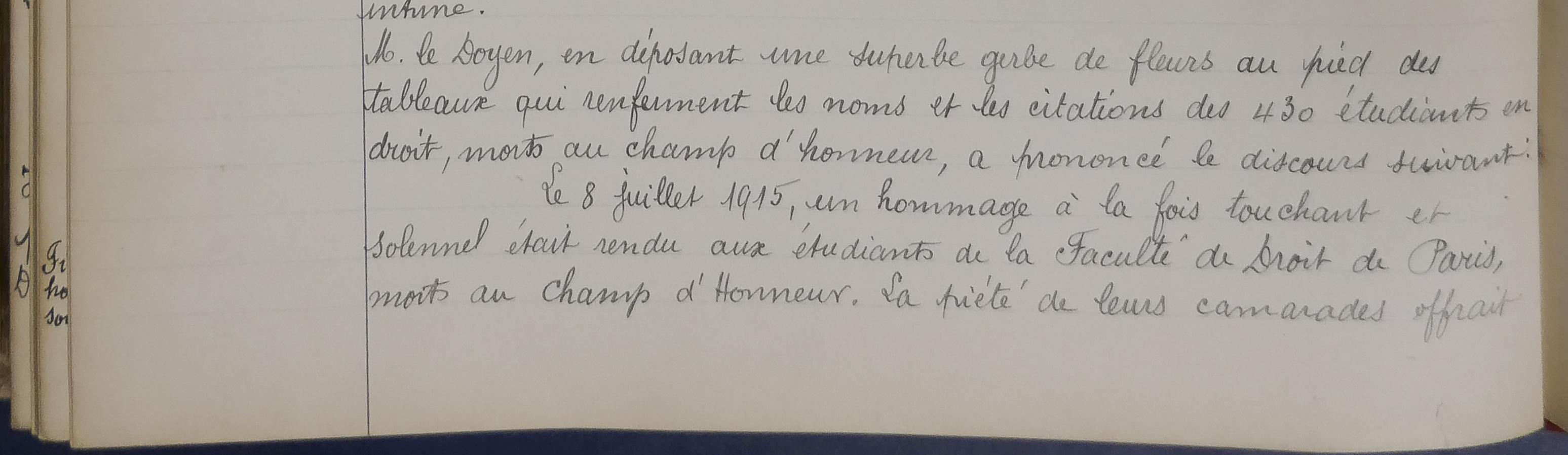 Transcription : « M. le Doyen, en déposant une superbe gerbe de fleurs au pied des tableaux qui renferment les noms et les citations des 430 étudiants en droit, morts au champ d'honneur, a prononcé le discours suivant :</br>Le 8 juillet 1915, un hommage à la fois touchant et solennel était rendu aux étudiants à la Faculté de Droit de Paris, morts au champ d'Honneur. La piété de leurs camarades offrait […] »</p>](/wp-content/uploads/cache/2018/10/Discours-de-Larnaude-durant-cérémonie-du-14-novembre-1918-Séance-assemblée-26-novembre-1918-AJ-16-1799/2139119010.jpg)