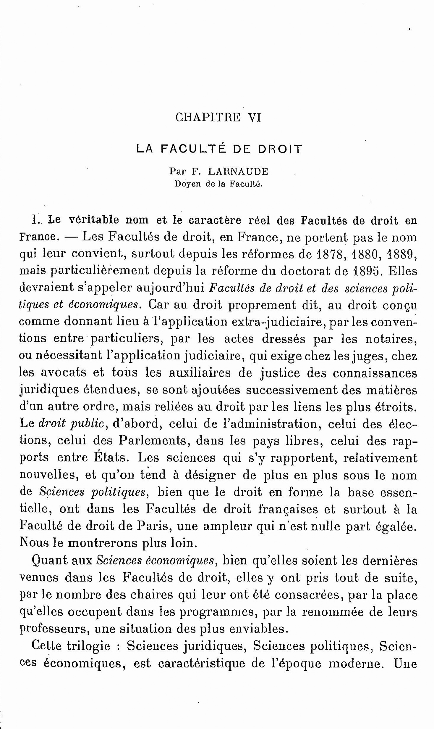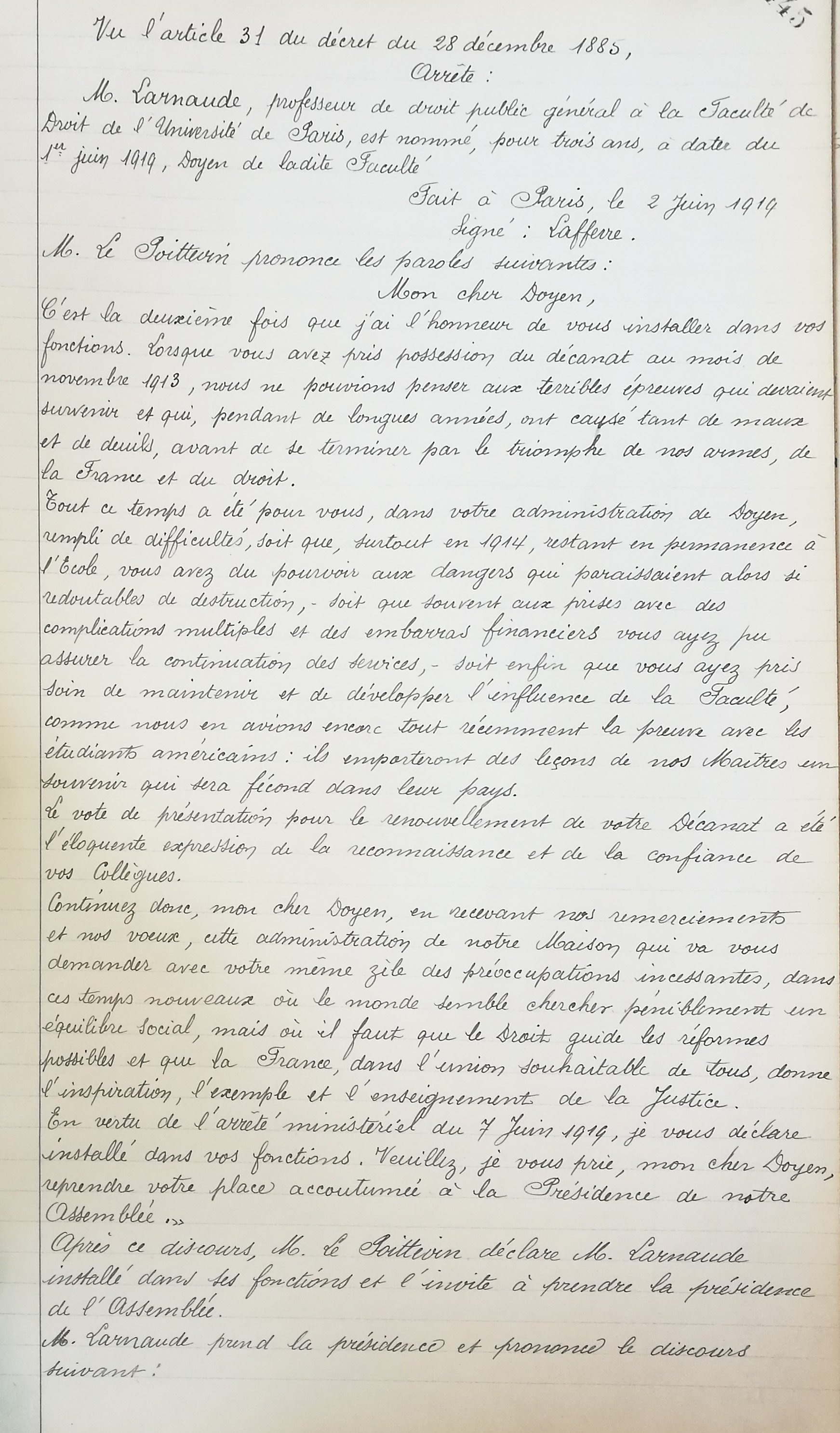 Transcription : « Vu l'article 31 du décret du 28 décembre 1885,</br>Arrête :</br>M. Larnaude, professeur de droit public général à la Faculté de Droit de l'Université de Paris, est nommé, pour trois ans, à date du 1<sup>er</sup> juin, Doyen de ladite Faculté.</br>Fait à Paris, le 2 juin 1919</br>Signé : Laferre.</br>M. Le Poittevin prononce les paroles suivantes :</br>Mon cher Doyen,</br>C’est la deuxième fois que j'ai l'honneur de vous installer dans vos fonctions. Lorsque vous avez pris possession du décanat au mois de novembre 1913, nous ne pouvions penser aux terribles épreuves qui devaient survenir et qui, pendant de longues années, ont causé tant de maux et de deuils, avant de se terminer par le triomphe de nos armes, de la France et du droit.</br>Tout ce temps a été pour vous, dans votre administration de Doyen, rempli de difficultés, soit que, surtout en 1914, restant en permanence à l'École, vous avez du pourvoir aux dangers qui paraissaient alors si redoutables de destruction, – soit que souvent aux prises avec des complications multiples et des embarras financiers vous ayez pu assurer la continuation des services, – soit enfin que vous ayez pris soin de maintenir et de développer l'influence de la Faculté, comme nous en avions encore tout récemment la preuve avec les étudiants américains : ils emporteront des leçons de nos Maîtres un souvenir qui sera fécond dans leur pays.</br>Le vote de présentation pour le renouvellement de votre Décanat a été l'éloquente expression de la reconnaissance et de la confiance de vos collègues.</br>Continuez donc, mon cher Doyen, en recevant nos remerciements et nos vœux, cette administration de notre Maison qui va vous demander avec votre même zèle des préoccupations incessantes, dans ces temps nouveaux où le monde semble chercher péniblement un équilibre social, mais où il faut que le Droit guide les réformes possibles et que la France, dans l'union souhaitable de tous, donne l'inspiration, l'exemple et l'enseignement de la Justice.</br>En vertu de l'arrêté ministériel du 7 juin 1914, je vous déclare installé dans vos fonctions. Veuillez, je vous prie, mon cher Doyen, reprendre votre place accoutumée à la Présidence de notre Assemblée.</br>Après ce discours, M. Le Poittevin déclare M. Larnaude installé dans ses fonctions et l'invite à prendre la présidence de l'Assemblée.</br>M. Larnaude prend la présidence et prononce le discours suivant : […] »</p>](/wp-content/uploads/cache/2018/10/Discours-de-Le-Poittevin-et-Larnaude-au-renouvellement-du-décanat-Registre-assemblée-faculté-séance-du-23-juin-1919-AJ-16-1799/2938183272.jpg)