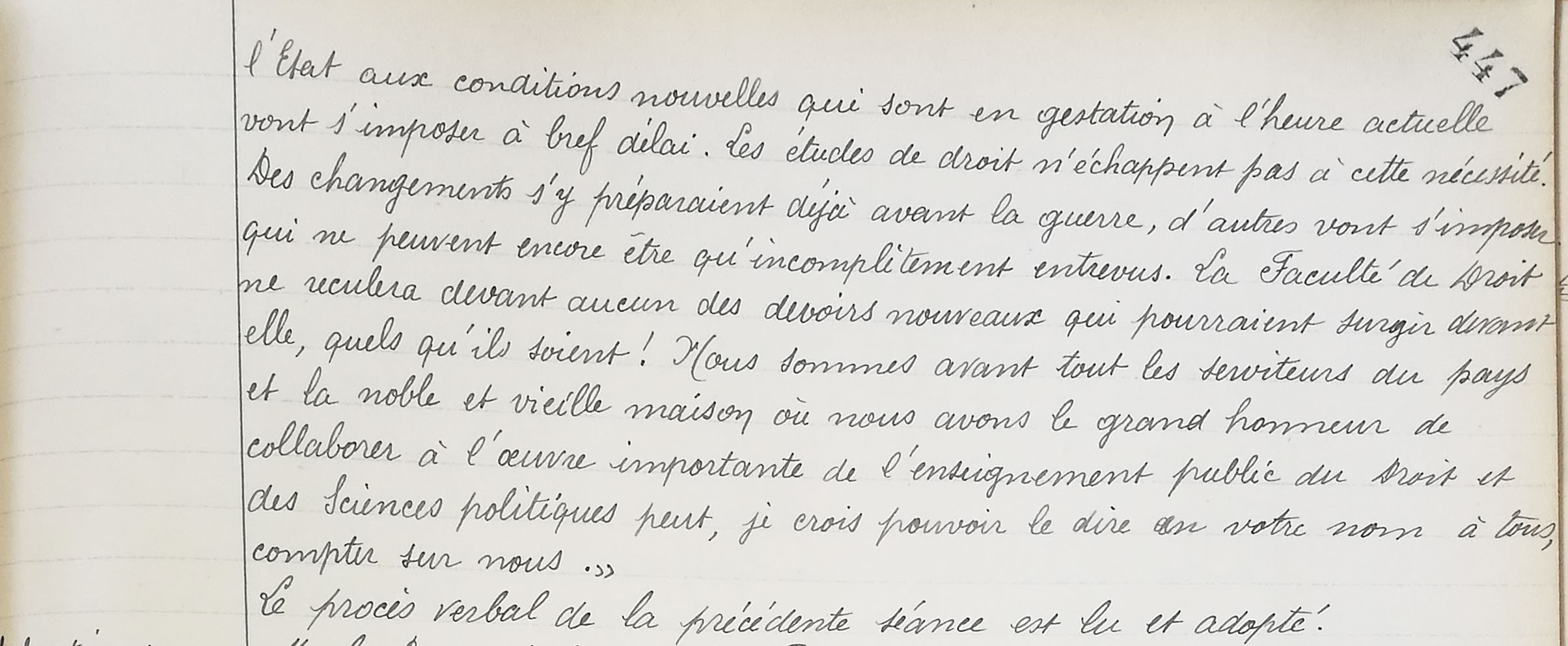 Transcription : « […] l'État aux conditions nouvelles qui sont en gestation à l'heure actuelle vont s'imposer à bref délai. Les études de droit n'échappent pas à cette nécessité. Des changements s'y préparaient déjà avant la guerre, d'autres vont s'imposer qui ne peuvent encore être qu'incomplètement entrevus. La Faculté de Droit ne reculera devant aucun des devoirs nouveaux qui pourraient surgir devant elle, quels qu'ils soient ! Nous sommes avant tout les serviteurs du pays et la noble et vieille maison où nous avons le grand honneur de collaborer à l'œuvre importante de l'enseignement public du Droit et des sciences politiques peut, je crois pouvoir le dire en votre nom à tous, compter sur nous.’</br>Le procès verbal de la précédente séance est lu et adopté. »</p>](/wp-content/uploads/cache/2018/10/Discours-de-Le-Poittevin-et-Larnaude-au-renouvellement-du-décanat-Registre-assemblée-faculté-séance-du-23-juin-1919-AJ-16-1799_3-2/528994.jpg)