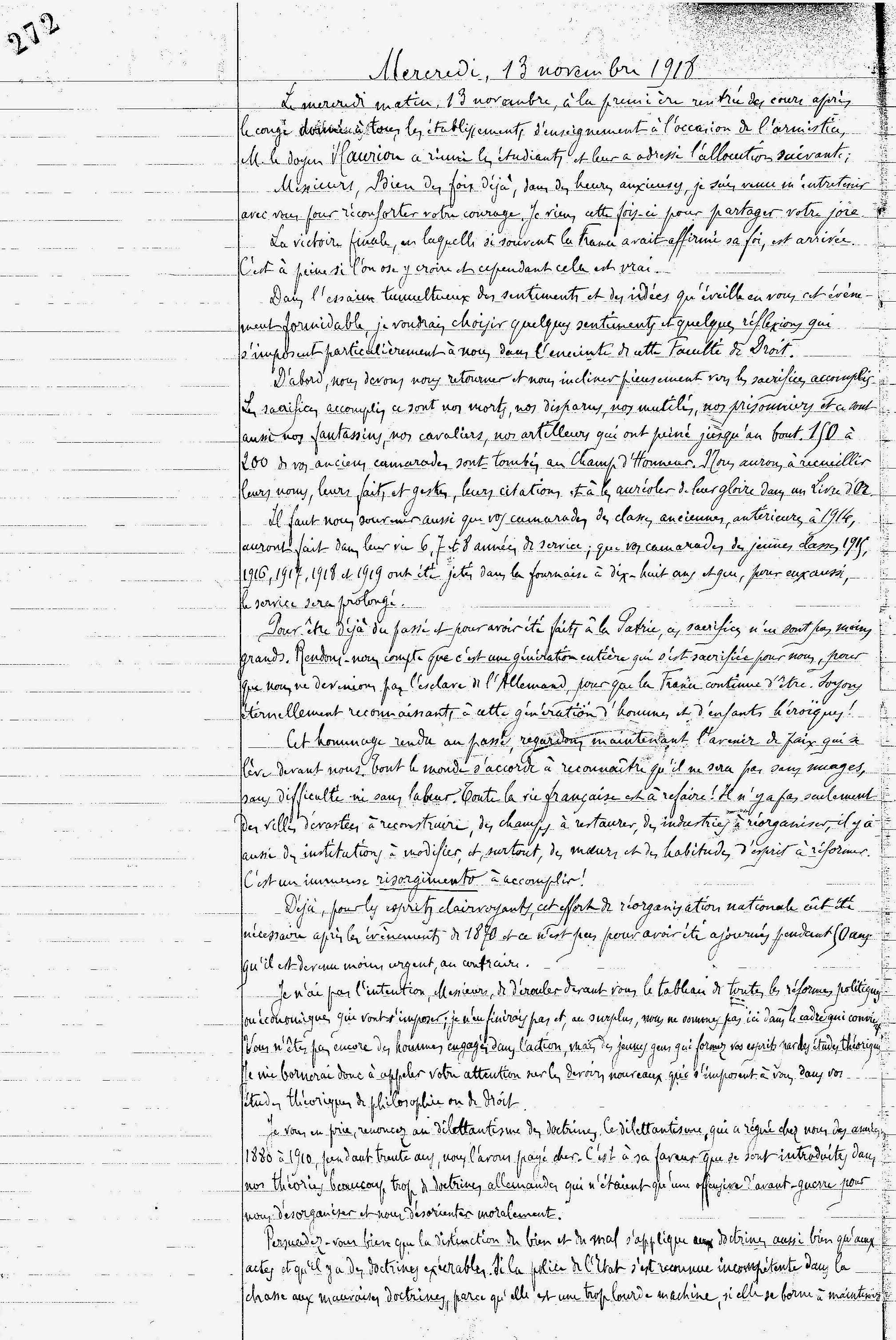 Transcription : « Mercredi, 13 novembre 1918</br>Le mercredi matin, 13 novembre, à la première rentrée de cours après la congé donné à tous les établissements d'enseignement à l'occasion de l'armistice, M. le doyen Hauriou a réuni les étudiants et leur a adressé l'allocution suivante :</br>Messieurs, Bien des fois déjà, dans des heures anxieuses, je suis venu m'entretenir avec vous pour réconforter votre courage. Je viens cette fois-ci pour partager votre joie.</br>La victoire finale, en laquelle si souvent la France avait affirmé sa foi, est arrivée. C'est à peine si l'on ose y croire et cependant cela est vrai.</br>Dans l'essaim tumultueux des sentiments et des idées qu'éveille en vous cet événement formidable, je voudrais choisir quelques sentiments et quelques réflexions qui s'imposent particulièrement à nous dans l'enceinte de cette Faculté de Droit.</br>D'abord, nous devons nous retourner et nous incliner pieusement vers les sacrifices accomplis. Les sacrifices accomplis ce sont nos morts, nos disparus, nos mutilés, nos prisonniers et ce sont aussi nos fantassins, nos cavaliers, nos artilleurs qui ont peiné jusqu'au bout. 150 à 200 de nos anciens camarades sont tombés au Champ d'Honneur. Nous aurons à recueillir leurs noms, leurs faits et gestes, leurs citations et à les auréoler de leur gloire dans un Livre d'Or.</br>Il faut nous souvenir aussi que vos camarades des classes anciennes, antérieures à 1914, auront fait dans leur vie 6, 7 et 8 années de service ; que vos camarades des jeunes classes 1915, 1916, 1917, 1918 et 1919 ont été jetés dans la fournaise à dix-huit ans et que, pour eux aussi, le service sera prolongé.</br>Pour être déjà du passé et pour avoir été faits à la Patrie, ces sacrifices n'en sont pas moins grands. Rendons-nous compte que c'est une génération entière qui s'est sacrifiée pour nous, pour que nous ne devenions pas l'esclave de l'Allemand, pour que la France continue d'être. Soyons éternellement reconnaissants à cette génération d'hommes et d'enfants héroïques !</br>Cet hommage rendu au passé, regardons maintenant l'avenir de paix qui se lève devant nous. Tout le monde s'accorde à reconnaître qu'il ne sera pas sans nuages, sans difficulté ni sans labeur. Toute la vie française est à refaire ! Il n'y a pas seulement des villes dévastées à reconstruire, des champs à restaurer, des industries à réorganiser, il y a aussi des institutions à modifier et, surtout, des mœurs et des habitudes d'esprit à réformer. C'est un immense <em>risorgimento</em> à accomplir !</br>Déjà pour les esprits clairvoyants, cet effort de réorganisation nationale eût été nécessaire après les événements de 1870 et ce n'est pas pour avoir été ajournés pendant 50 ans qu'il est devenu moins urgent, au contraire.</br>Je n'ai pas l'intention, Messieurs, de dérouler devant vous le tableau de toutes les réformes politiques ou économiques qui vont s'imposer ; je n'en finirais pas et, au surplus, nous ne sommes pas ici dans le cadre qui convient. Vous n'êtes pas encore des hommes engagés dans l'action, mais de jeunes gens qui formez vos esprits par des études théoriques. Je me bornerai donc à appeler votre attention sur les devoirs nouveaux qui s'imposent à vous dans vos études théoriques de philosophie ou de droit.</br>Je vous en prie, remontez au dilettantisme des doctrines. Ce dilettantisme, qui a régné chez nous des années 1880 à 1910, pendant trente ans, nous l'avons payé cher. C'est à sa faveur que ce sont introduites dans nos théories beaucoup trop de doctrines allemandes qui n'étaient qu'une offensive d'avant-guerre pour nous désorganiser et nous désorienter moralement.</br>Persuadez-vous bien que la distinction du bien et du mal s'applique aux doctrines aussi bien qu'aux actes et qu'il y a des doctrines exécrables. Si la police de l'État s'est reconnue incompétente dans la chasse aux mauvaises doctrines, parce qu'elle est une trop lourde machine, si elle se borne à maintenir […] »</p>](/wp-content/uploads/cache/2018/10/Séance-13-novembre-1918-feuillet-272/3189158653.jpg)