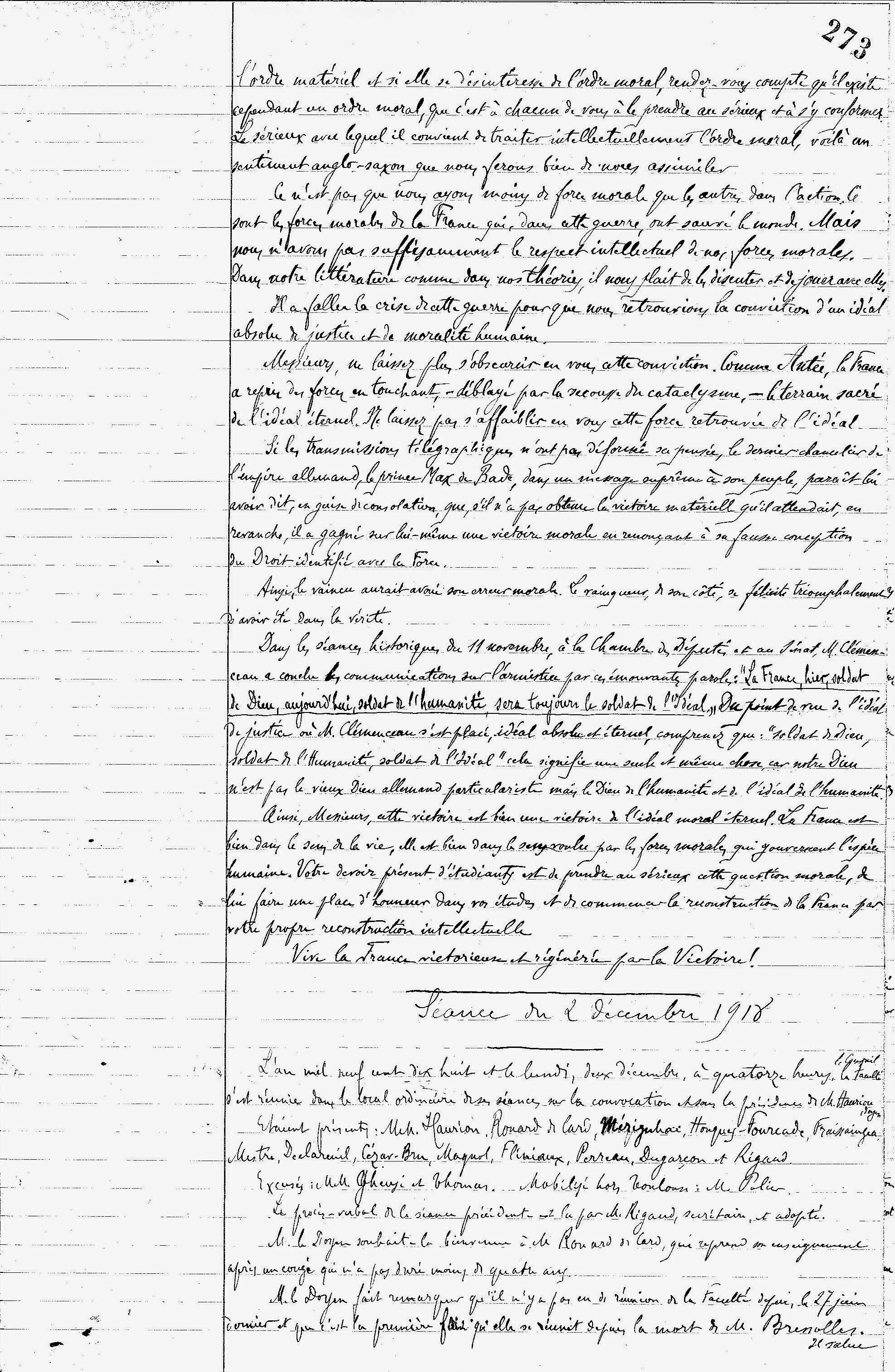 Transcription : « […] l'ordre matériel et si elle se désintéresse de l'ordre moral, rendez-vous compte qu'il existe cependant un ordre moral, que c'est à chacun de vous à le prendre au sérieux et à s'y conformer. Le sérieux avec lequel il convient de traiter intellectuellement l'ordre moral, voilà un sentiment anglo-saxon que nous ferons bien de vous assimiler.</br>Ce n'est pas que nous ayons moins de force morale que les autres dans l'action. Ce sont les forces morales de la France qui, dans cette guerre, ont sauvé le monde. Mais nous n'avons pas suffisamment le respect intellectuel de nos forces morales. Dans notre littérature comme dans nos théories, il nous plait de les discuter et de jouer avec elles.</br>Il a fallu la crise de cette guerre pour que nous retrouvions la conviction d'un idéal absolu de justice et de moralité humaine.</br>Messieurs, ne laissez plus s'obscurcir en vous cette conviction. Comme Antée, la France a repris des forces en touchant, – déblayé par la secousse du cataclysme –, le terrain sacré de l'idéal éternel. Ne laissez pas s'affaiblir en vous cette force retrouvée de l'idéal.</br>Si les transmissions télégraphiques n'ont pas déformé sa pensée, le dernier chancelier de l'empire allemand, le prince Max de Bade, dans un message suprême à son peuple, paraît lui avoir dit, en guise de consolation, que, s'il n'a pas obtenu la victoire matérielle qu'il attendait, en revanche, il a gagné sur lui-même une victoire morale en renonçant à sa fausse conception du Droit identifié avec la Force.</br>Ainsi, le vaincu aurait avoué son erreur morale. Le vainqueur, de son côté, se félicite triomphalement d'avoir été dans la vérité.</br>Dans les séances historiques du 11 novembre, à la Chambre des Députés et au Séant, M. Clémenceau a conclu les communications de l'armistice par ces émouvantes paroles : ‘La France, hier, soldat de Dieu, aujourd'hui, soldat de l'humanité, sera toujours le soldat de l'idéal.’ Du point de vue de l'idéal de justice où M. Clémenceau s'est placé, idéal absolu et éternel, comprenez que : ‘soldat de Dieu, soldat de l'humanité, soldat de l'idéal’ cela signifie une seule et même chose car notre Dieu n'est pas le vieux Dieu allemand particulariste mais le Dieu de l'humanité et de l'idéal de l'humanité.</br>Ainsi, Messieurs, cette victoire est bien une victoire de l'idéal moral éternel. La France est bien dans le sens de la vie, elle est bien dans le sens voulu par les forces morales qui gouvernent l'espèce humaine. Votre devoir présent d'étudiants est de prendre au sérieux cette question morale, de lui faire une place d'honneur dans vos études et de commencer la reconstruction de la France par votre propre reconstruction intellectuelle.<br>Vive la France victorieuse et régénérée par la Victoire ! »</p>](/wp-content/uploads/cache/2018/10/Séance-13-novembre-1918-feuillet-273/2828258183.jpg)