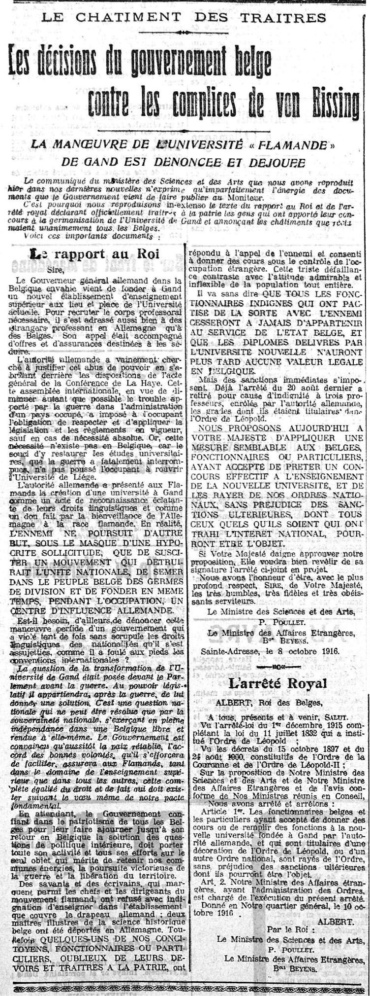 For the Belgian academic community, the question of academic neutrality during the war was particularly acute following the opening of the Von Bissing University in Ghent by the occupying authorities. Very quickly, on this point in any case, neutrality proved impossible. From then on, two camps were set up. This first document is a newspaper article that presents the reactions of the Belgian government in exile and the sanctions planned from 1916 onwards against professors who had collaborated in this university, in anticipation of the end of the war.