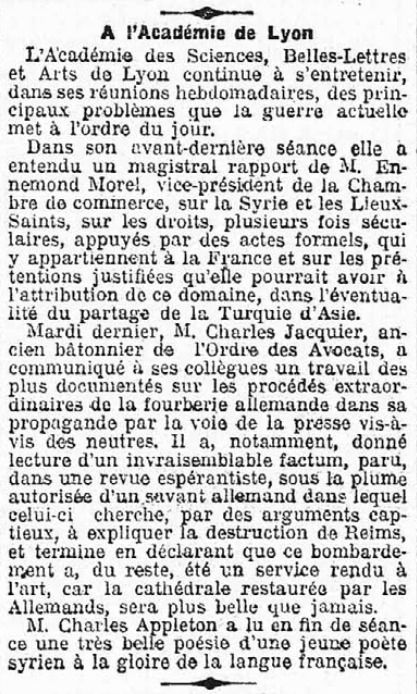 Another example is that of Charles Jacquier, dean of the Catholic Faculty of Law in Lyon since 1906 and former president of the Lyon Bar Association. As this document and the following three show, he was heavily involved in public life throughout the war, but mainly at the local and regional level. As a member of the Academy of Sciences, Literature and Arts of Lyon, he used this platform to denounce German propaganda.