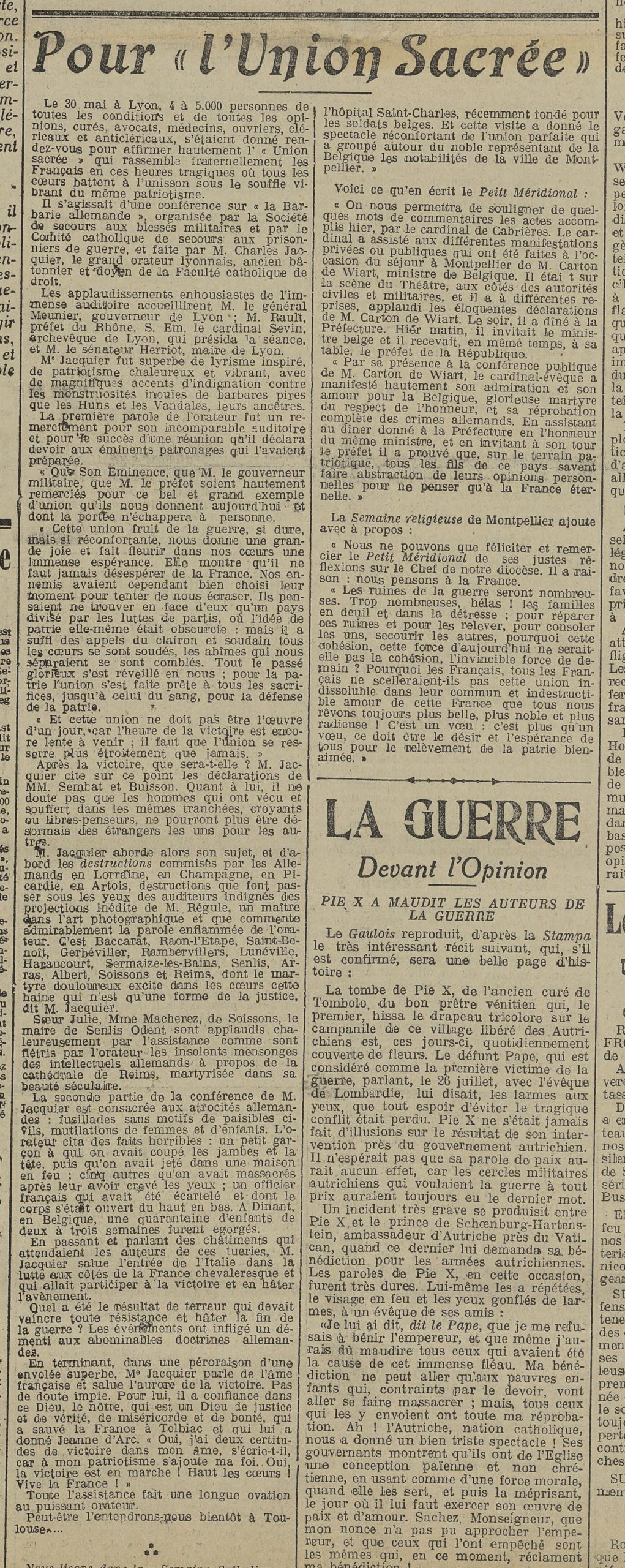 In another intervention, Dean Jacquier was appointed as speaker for the important gathering on 30 May 1915 in Lyon, recounted here. Bringing together religious, civil and military authorities from the city before an audience of 4,000 to 5,000 people who had come to celebrate the Sacred Union, it was an opportunity for the lawyer to give a speech on ‘German barbarism’, in which he asserted that in the circumstances of this war, hatred was a form of justice.