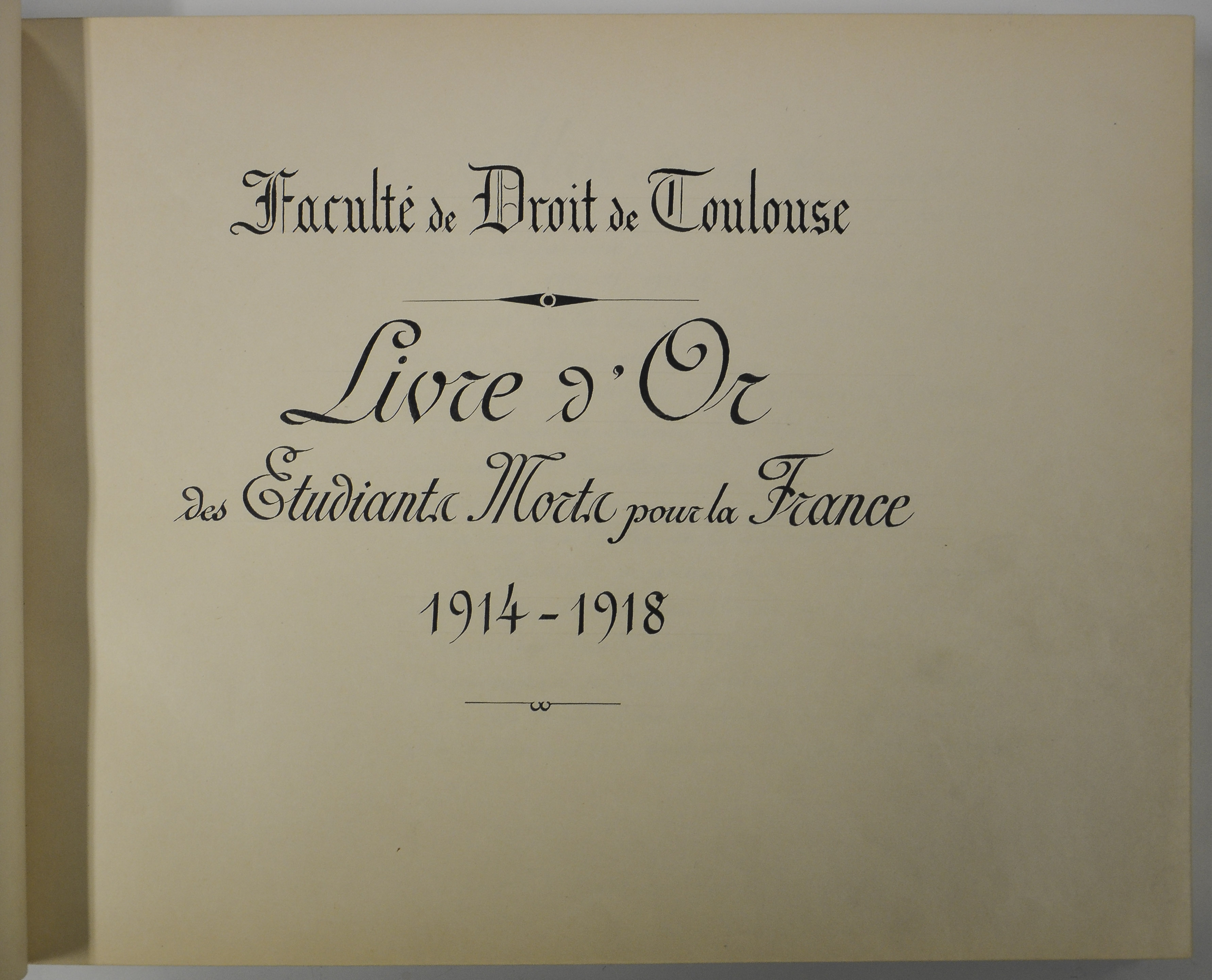 The idea of a Livre d'Or emerged at the Paris Faculty of Law with the reception of the first news of students who had died in combat. Documents were collected from the end of 1914 to the beginning of 1915. However, it took some time for the work to be completed, and it was finally written in 1924 and printed in 1925. It contains the names of some 700 students, former students, professors and staff members who died for France. The writing of the preface was one of the last opportunities for Ferdinand Larnaude to promote the war on law.
