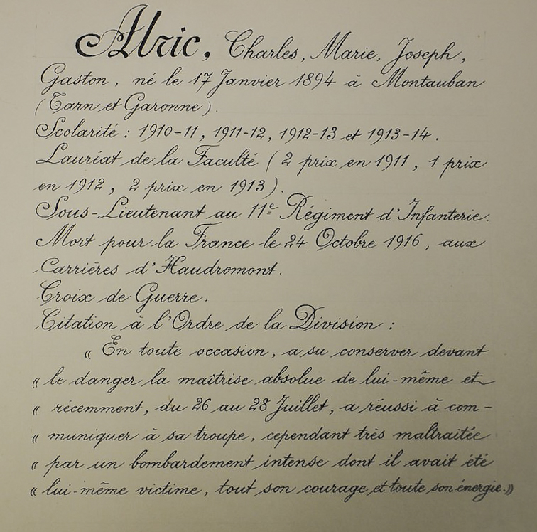 Source: Archives of Toulouse 1 Capitole University – Series Z, Heritage registers.Note on Charles Alric (1894-1916) in the Golden Book of the Toulouse Faculty of Law. He graduated from the Faculty on several occasions, obtained his law degree in 1913 and became a lawyer. He was cited as an example by Dean Hauriou on several occasions during the conflict and in 1919 during the inauguration of the temporary monument dedicated to the Faculty's dead.