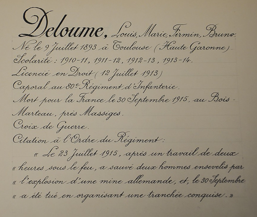 Source: Archives of Toulouse 1 Capitole University – Series Z, Heritage registers.Note on Louis Deloume (1893-1915) in the Livre d'Or of the Toulouse Faculty of Law. He belonged to a family of Toulouse jurists and professors at the Faculty of Law in the 19th century. His grandfather, Antonin Deloume, was dean from 1906 to 1911. L. Deloume received his law degree in 1913 and was a lawyer in 1914. He died in a German counter-attack on September 30, 1915.