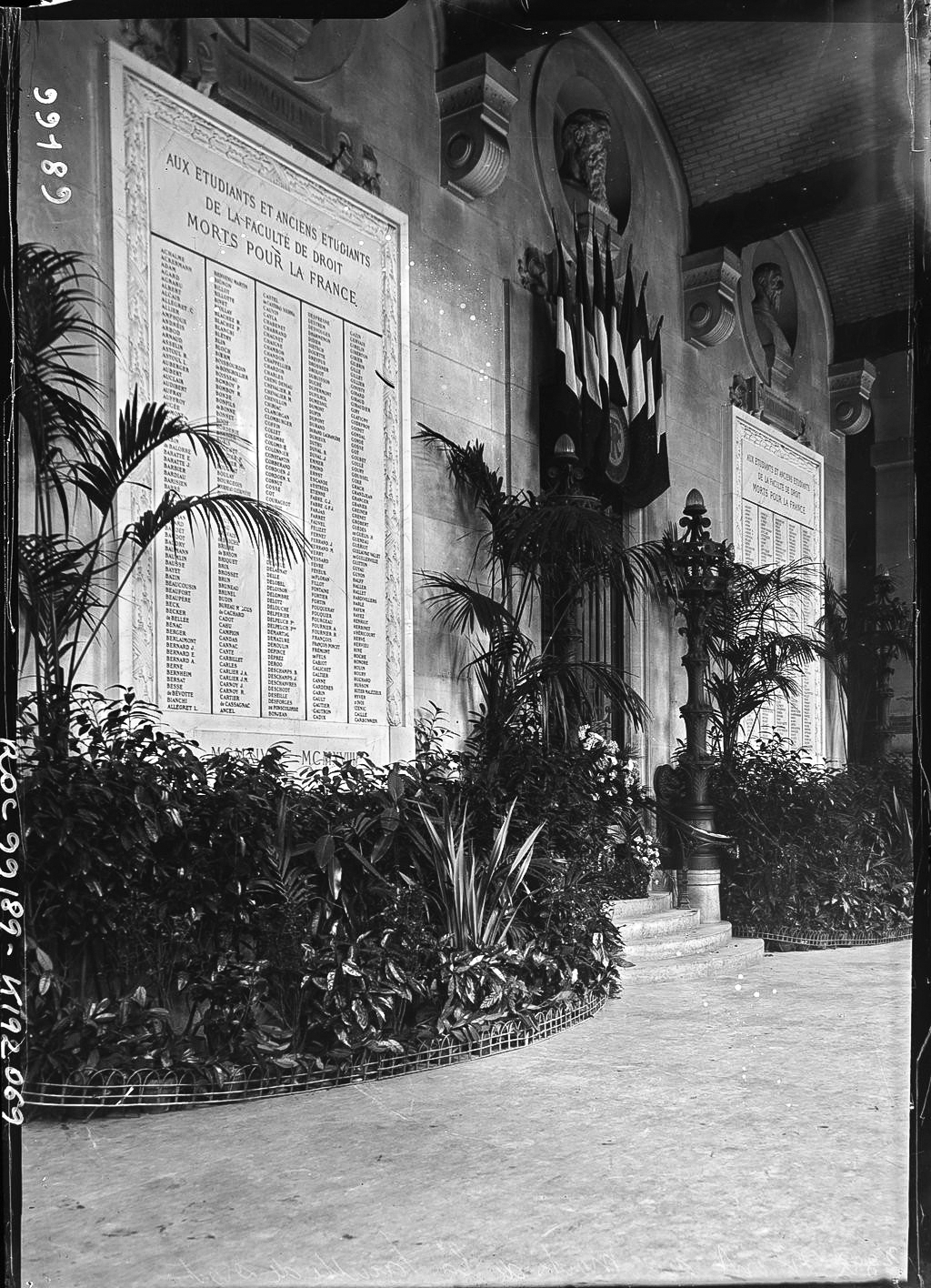 Source: gallica.bnf.fr / Bibliothèque nationale de France.To pay tribute to the students and former students of the Paris Faculty of Law who died on the field of honor, two marble plaques bearing their names were made and installed for the beginning of the school year in 1923. Although the question of an inauguration ceremony was raised at the faculty assembly in December of that year, it did not materialize until 1925.