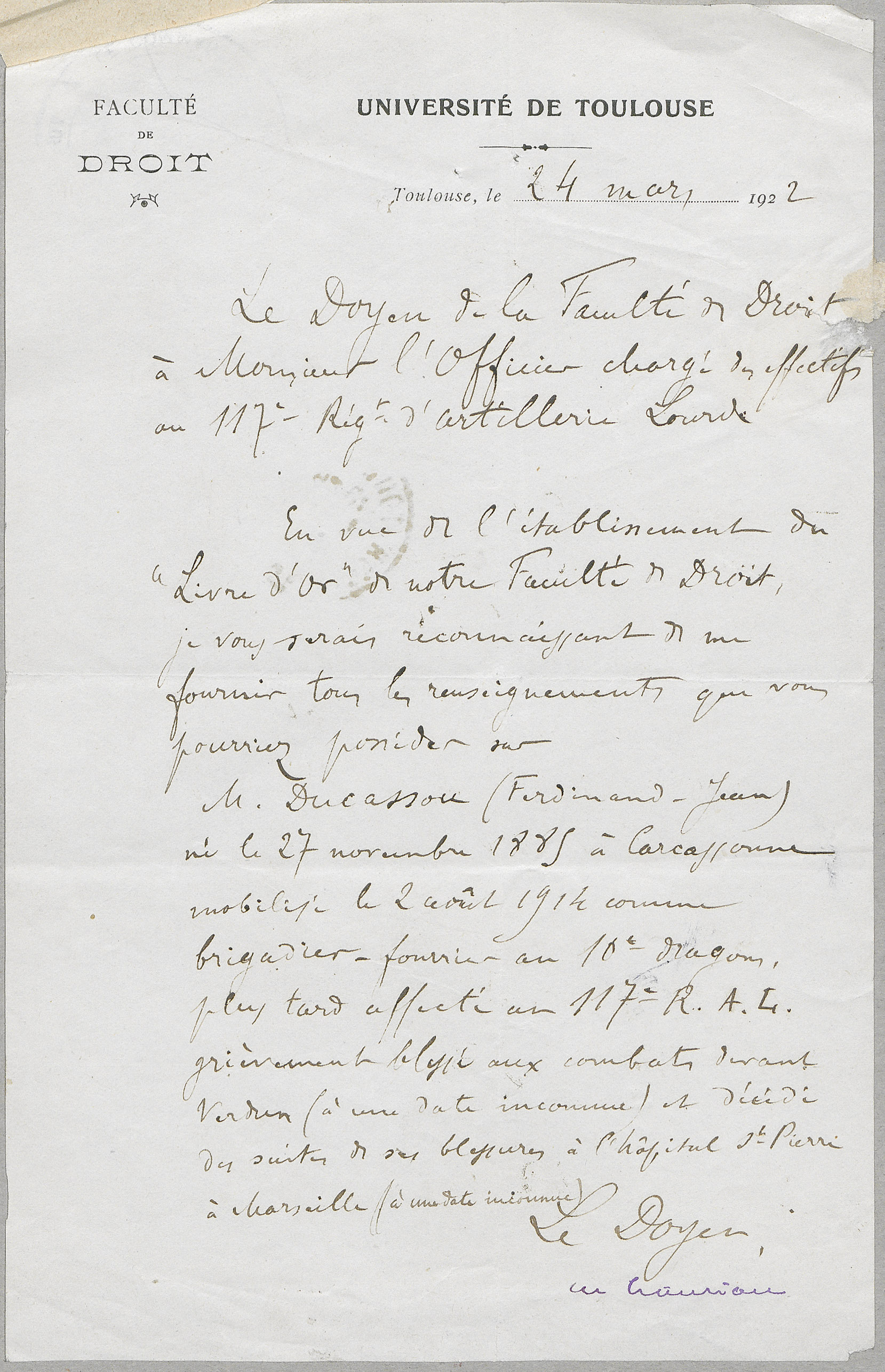 Transcription : « Faculté de droit. Université de Toulouse. Toulouse, le 24 mars 1922Le Doyen de la Faculté de Droit à Monsieur l'Officier chargé des effectifs au 117e Régt d'artillerie Lourde.En vue de l'établissement du ‘Livre d'Or’ de notre Faculté de Droit, je vous serais reconnaissant de me fournir tous les renseignements que vous pourriez posséder sur M. Ducassou (Ferdinand-Jean) né le 27 novembre 1885 à Carcassonne mobilisé le 2 août 1914 comme brigadier-fourrier au 16e dragon, plus tard affecté au 117e R.A.L.grièvement blessé aux combats durant Verdun (à une date inconnue) et décédé des suites de ses blessures à l'hôpital St Pierre à Marseille (à une date inconnue)Le Doyen,M. Hauriou »