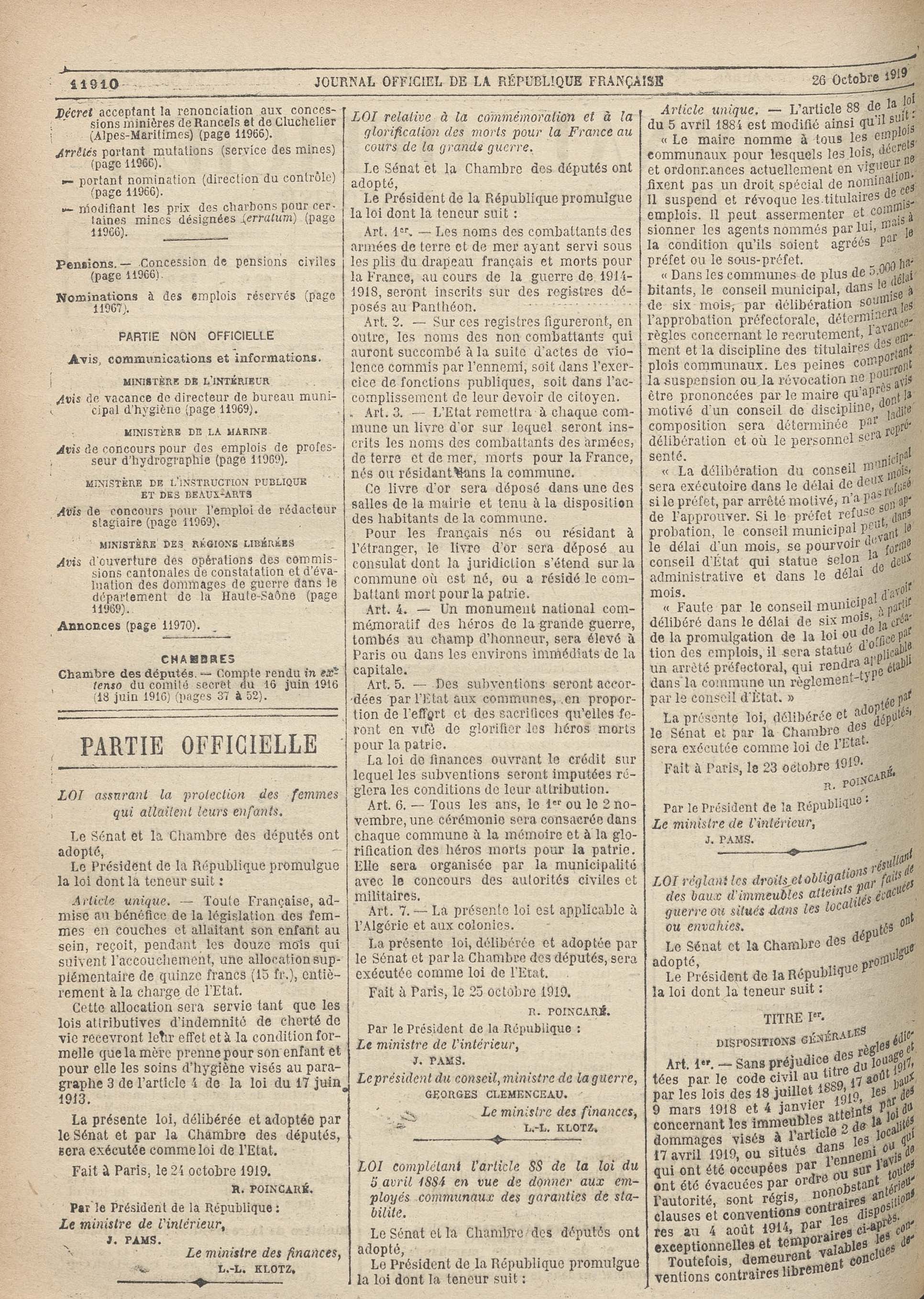 « Loi relative à la commémoration et à la glorification des morts pour la France au cours de la grande guerre »Journal Officiel de la République, 26 October 1919.