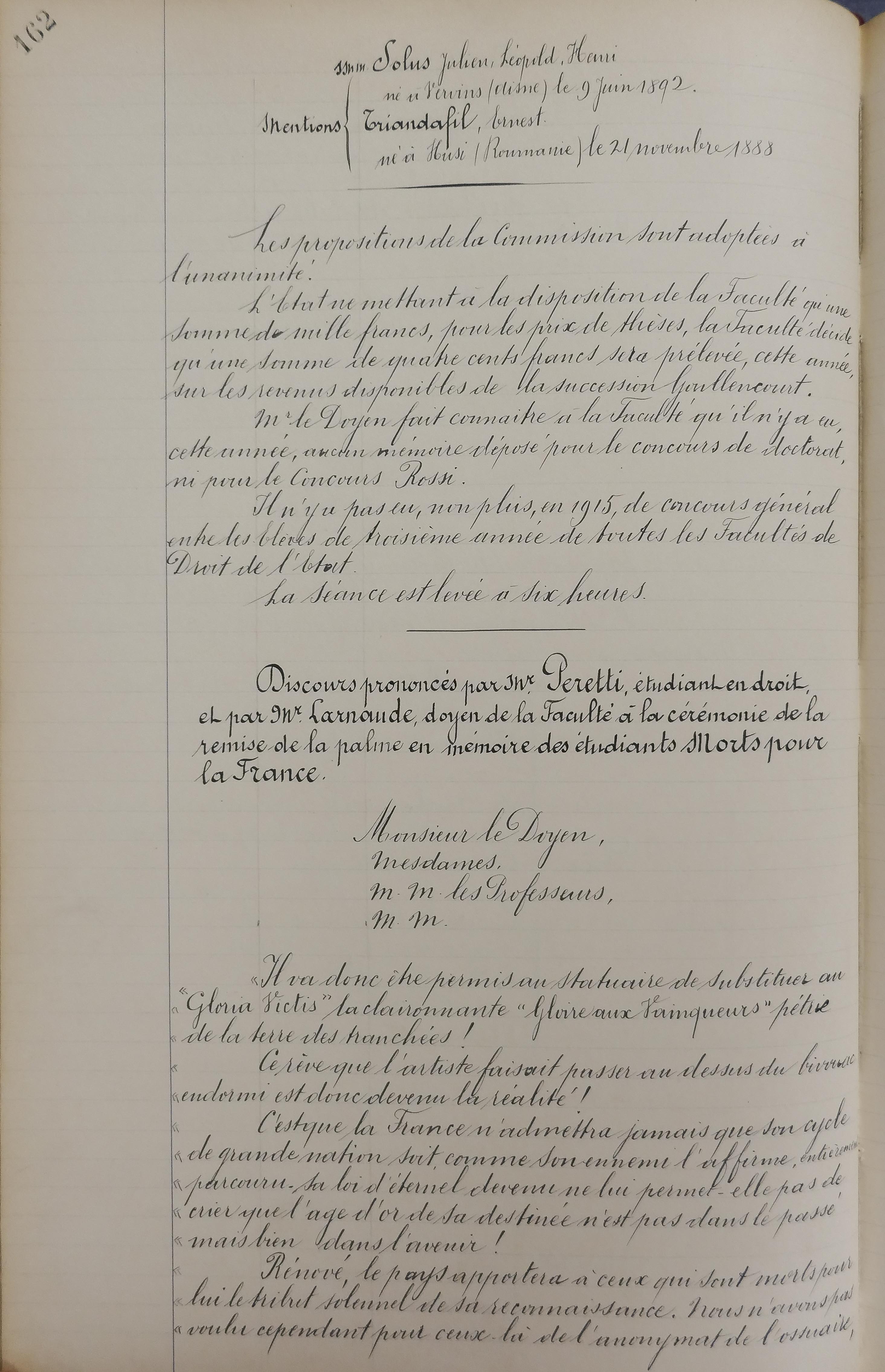 « Discours prononcés par M. Peretti, étudiant en droit, et par M. Larnaude, doyen de la faculté, à la cérémonie de remise de la palme en mémoire des étudiants morts pour la France. [8 July 1915] », Registres de délibérations du conseil et de l'assemblée de la Faculté de Droit de Paris, séance de l'assemblée du 16 juillet 1915 (end).