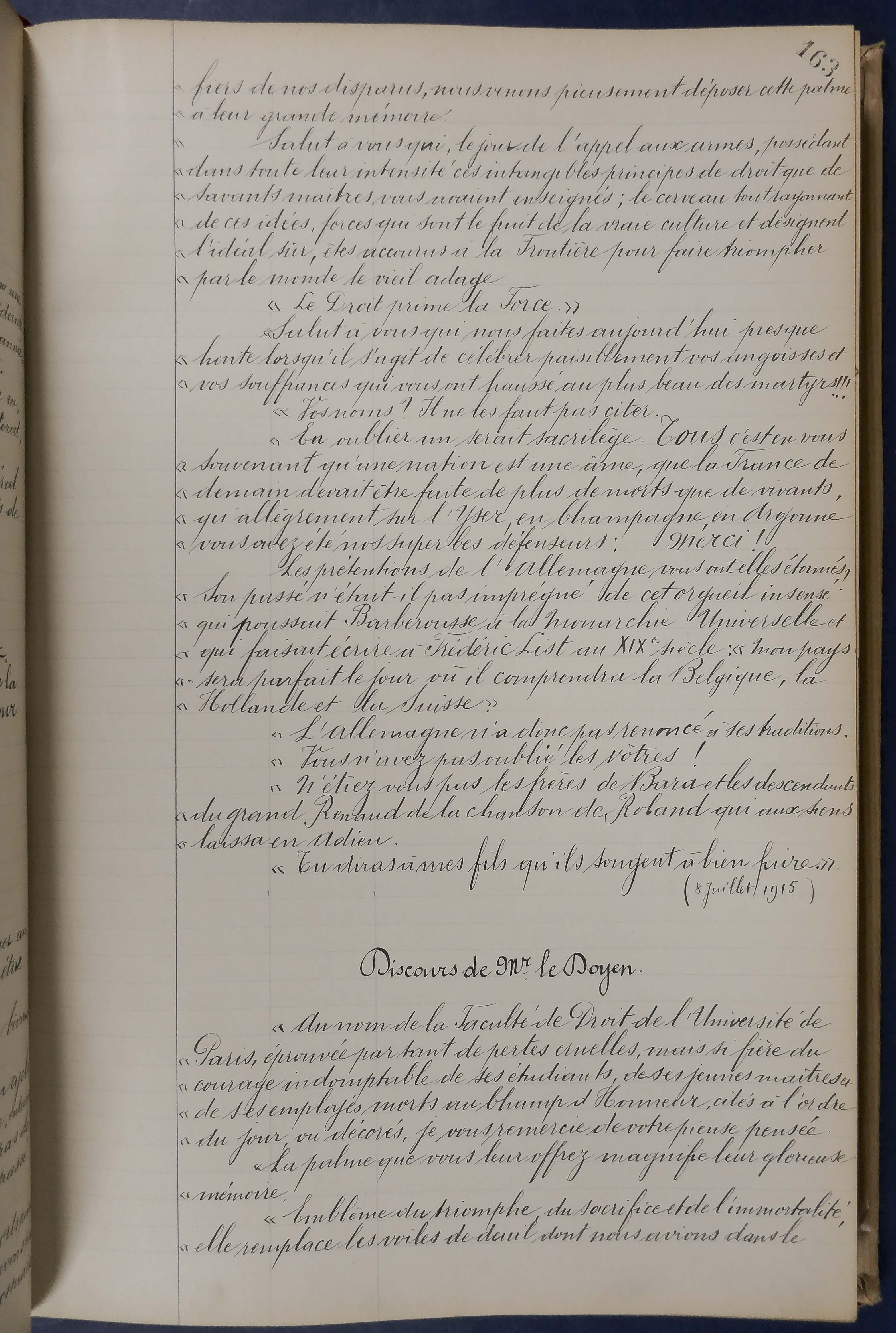 Transcription : « […] fiers de nos disparus, nous venons pieusement déposer cette palme à leur grande mémoire. Salut à vous qui, le jour de l'appel aux armes, possédant dans toute leur intensité ces intangibles principes de droit que de savants maîtres vous avaient enseignés ; le cerveau tout rayonnant de ces idées, forces qui sont le fruit de la vraie culture et désignent l'idéal sûr, êtes accourus à la Frontière pour faire triompher par le monde le vieil adage ‘Le Droit prime la Force.’ Salut à vous qui nous faites aujourd'hui presque honte lorsqu'il s'agit de célébrer paisiblement vos angoisses et vos souffrances qui vous ont hausser au plus beau des martyrs !!! Vos noms ? Il ne les faut pas citer. En oublier un serait sacrilège. Tous c'est en vous souvenant qu'une nation est une âme, que la France de demain devait être faite de plus de morts que de vivants, qu'allègrement sur l'Yser, en Champagne, en Argonne vous avez été nos superbes défenseurs : merci ! Son passé n'était-il pas imprégné de cet orgueil insensé qui poussait Barberousse à la Monarchie Universelle et qui faisait écrire à Frédéric List au xixe siècle : ‘Mon pays sera parfait le jour où il comprendra la Belgique, la Hollande et la Suisse.’L'Allemagne n'a donc pas renoncé à ses traditions.Vous n'avez pas oublié les vôtres !N'étiez-vous pas les frères de Bara et les descendants du grand Renaud de la chanson de Roland qui aux siens laissa en adieu :‘Tu diras à mes fils qu'ils songent à bien faire.’(8 juillet 1915)Discours de Mr le Doyen.Au nom de la Faculté de Droit de l'Université de Paris, éprouvée par tant de pertes cruelles, mais si fière du courage indomptable de ses étudiants, de ses jeunes maîtres et de ses employés morts au Champ d'Honneur, cités à l'ordre du jour ou décorés, je vous remercie de votre pieuse pensée.La palme que vous leur offrez magnifie leur glorieuse mémoire.Emblème du triomphe du sacrifice et de l'immortalité, elle remplace les voiles de deuil dont nous avions dans le […] »
