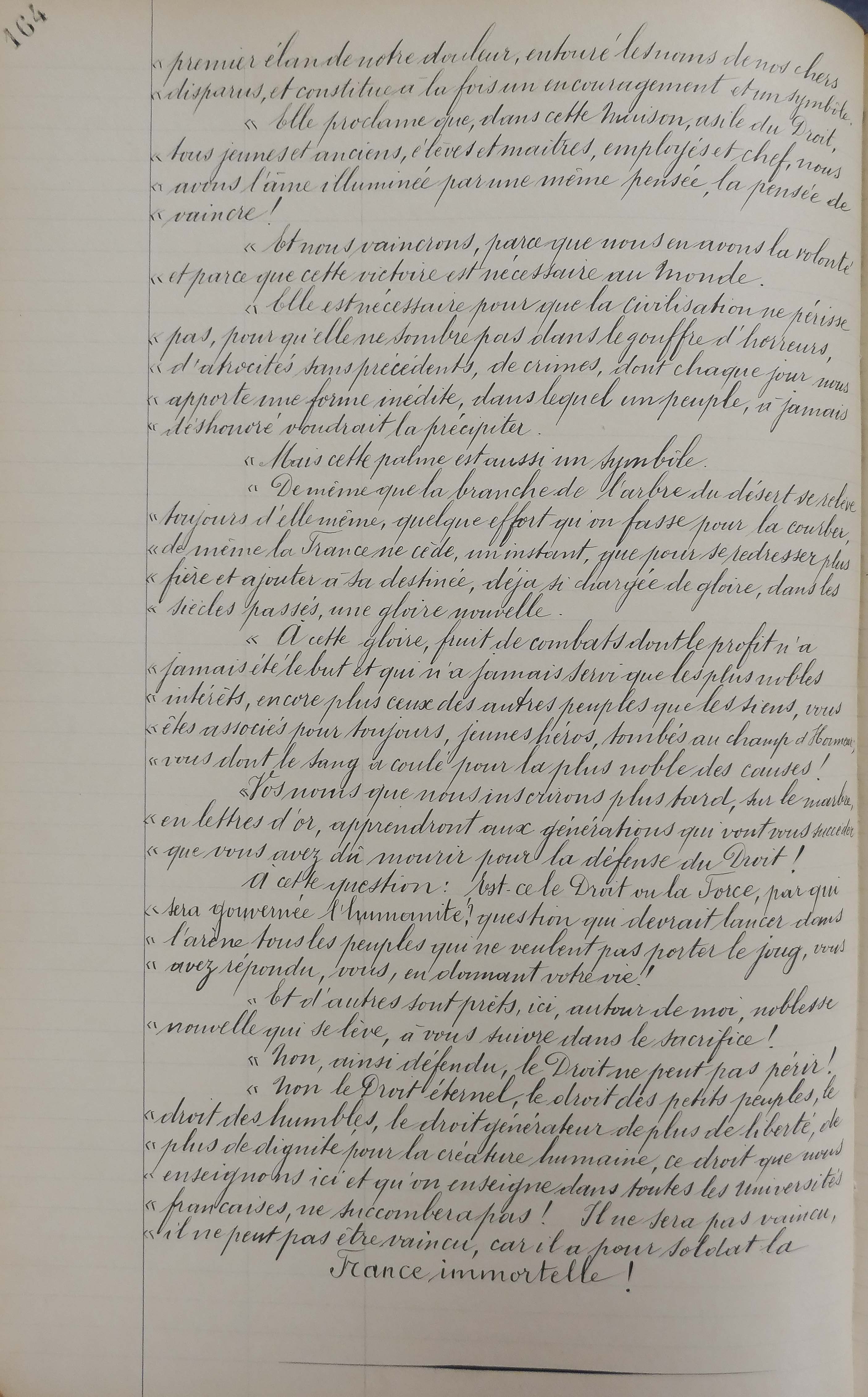 Transcription : « […] premier élan de notre douleur, entouré les noms de nos chers disparus, et constitue à la fois un encouragement et un symbole.Elle proclame que, dans cette maison, asile du Droit, tous jeunes et anciens, élèves et maîtres, employés et chef, nous avons l'âme illuminée par une même pensée, la pensée de vaincre !Et nous vaincrons, parce que nous en avons la volonté et parce que cette victoire est nécessaire au monde.Elle est nécessaire pour que la civilisation ne périsse pas, pour qu'elle ne sombre pas dans le gouffre d'horreurs, d'atrocités sans précédents, de crimes, dont chaque jour nous apporte une forme inédite, dans lequel un peuple, à jamais déshonorer voudrait la précipiter.Mais cette palme est aussi un symbole.De même que la branche de l'arbre du désert se relève toujours d'elle-même, quelque effort qu'on fasse pour la courber, de même la France ne cède, un instant, que pour se redresser plus fière et ajouter à sa destinée, déjà si chargée de gloire, dans les siècles passés, une gloire nouvelle.À cette gloire, fruit de combats dont le profit n'a jamais été le but et qui n'a jamais servi que les plus nobles intérêts, encore plus ceux des autres peuples que les siens, vous êtes associés pour toujours, jeunes héros, tombés au champ d'Honneur ; vous dont le sang a coulé pour la plus noble des causes !Vos noms que nous inscrirons plus tard, sur le marbre, en lettres d'or, apprendront aux générations qui vont vous succéder que vous avez dû mourir pour la défense du Droit !À cette question : est-ce le Droit ou la Force, par qui sera gouvernée l'humanité ? question qui devrait lancer dans l'arène tous les peuples qui ne veulent pas porter le joug, vous avez répondu, vous, en donnant votre vie !Et d'autres sont prêts, ici, autour de moi, noblesse nouvelle qui se lève, à vous suivre dans le sacrifice !Non, ainsi défendu, le Droit ne peut pas périr !Non le droit éternel, le droit des petits peuples, le droit des humbles, le droit générateur de plus de liberté, de plus de dignité pour la créature humaine, ce droit que nous enseignons ici et qu'on enseigne dans toutes les universités françaises, ne succombera pas ! Il ne sera pas vaincu, il ne peut pas être vaincu, car il a pour soldat la France immortelle ! »