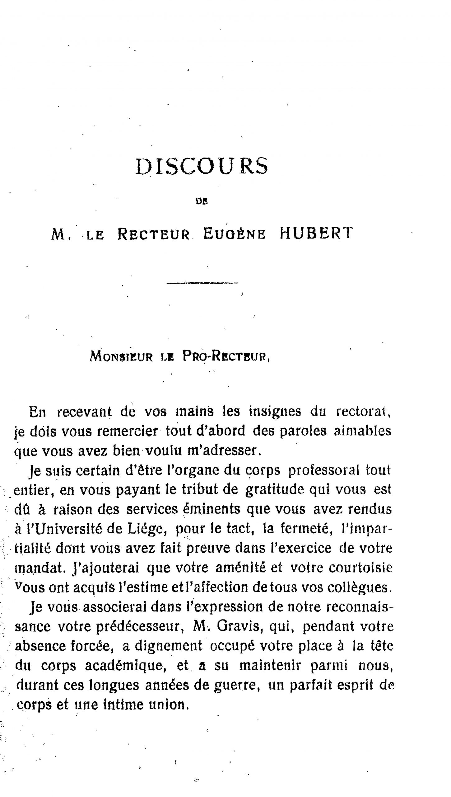 Eugène Hubert, Discours [Solemn first day of class ], Liège, 21 January 1919