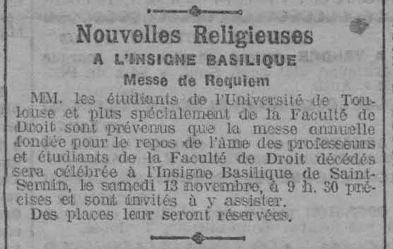 « Nouvelles Religieuses à l'Insigne Basilique. Messe de Requiem », Express du Midi, n° 8341, Friday, 12 November 1915.