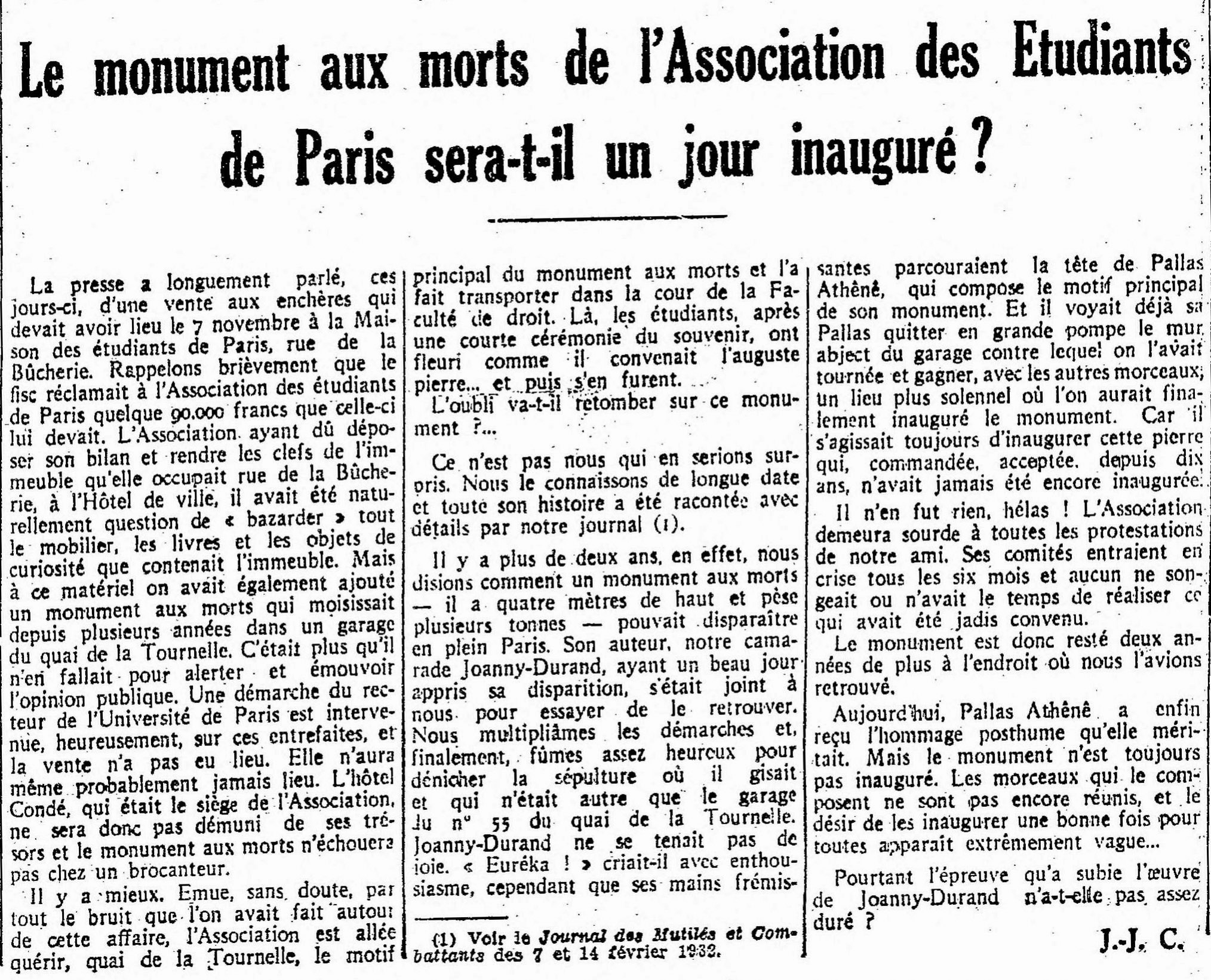 « Le monument aux morts de l'Association des Étudiants de Paris sera-t-il un jour inauguré ? », Journal des mutilés, réformés et blessés de guerre, 19e année, n° 933, 16 December 1934.