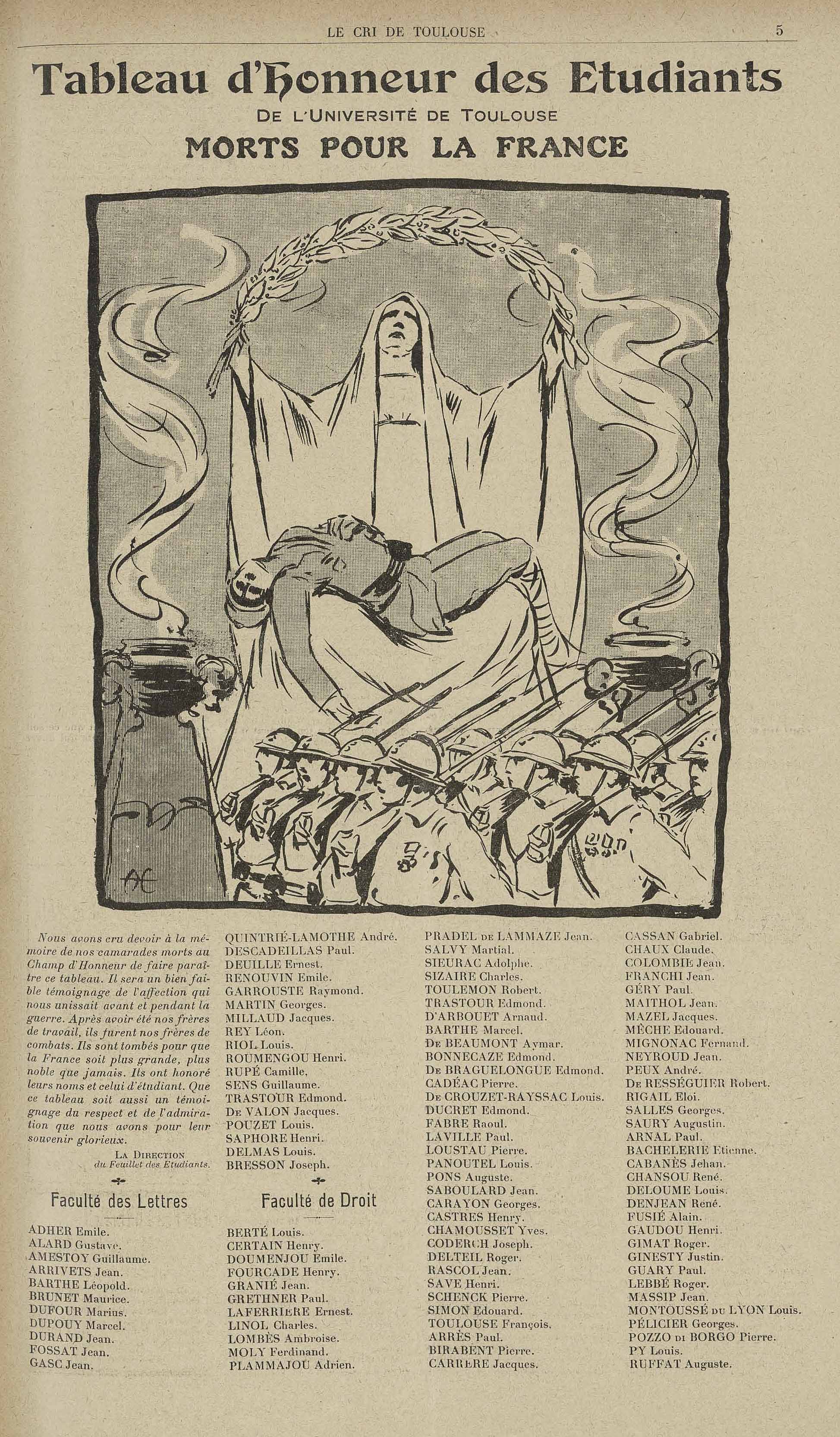 Source: Toulouse-Rosalis city library, class. no P3676While a temporary honor roll was inaugurated at the faculty in June 1919, Le Cri de Toulouse published in its pages this Honor Roll of the students of the University of Toulouse who died for France, drawn up by those in charge of the student section of the newspaper.