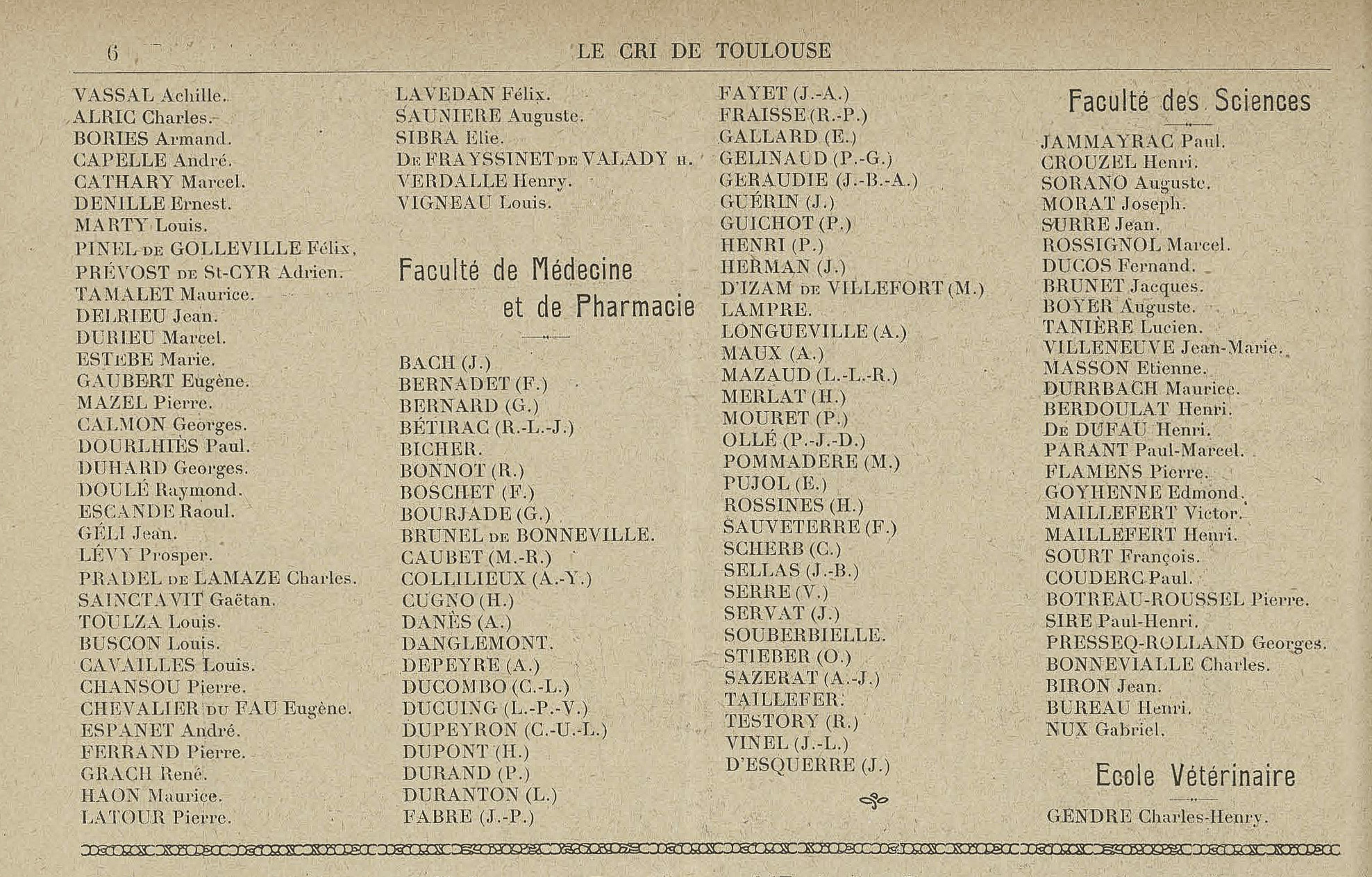 « Tableau d’honneur des étudiants de l’Université de Toulouse morts pour la France », Le Cri de Toulouse, 13 March 1920.