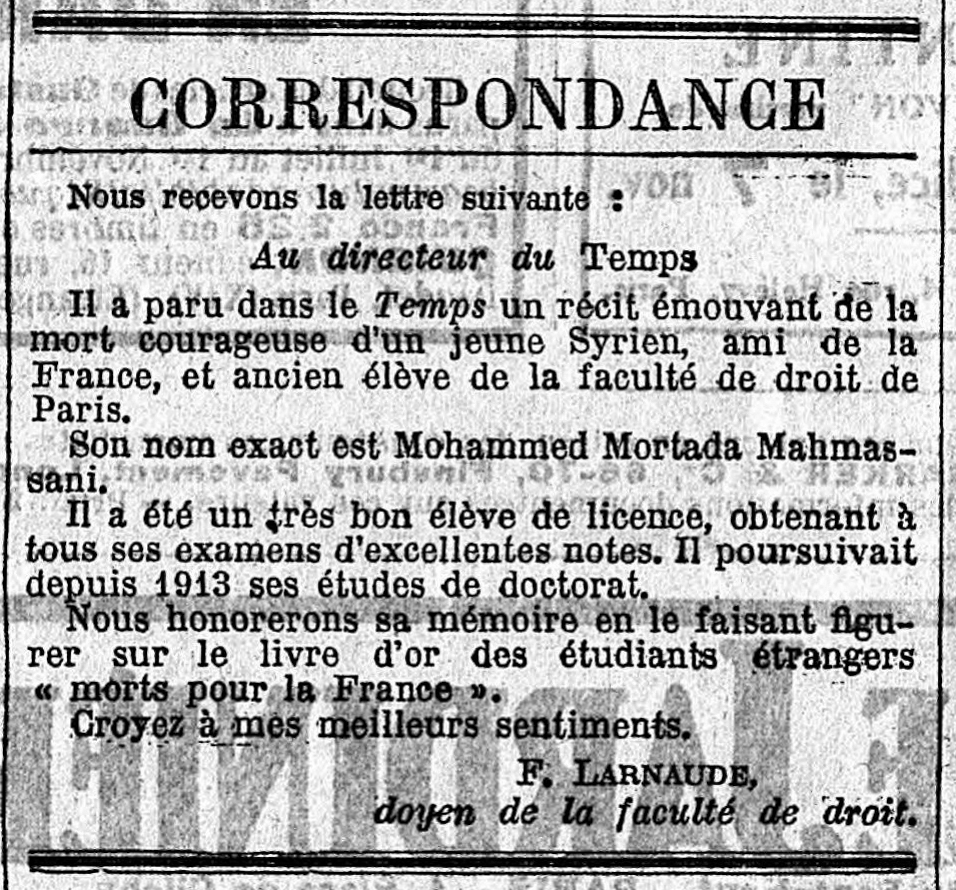 Source: gallica.bnf.fr / Bibliothèque nationale de France.In October 1915, having read in Le Temps the news of the death on the field of honor of a Syrian student, a former student of the Paris Faculty of Law, Dean Ferdinand Larnaude was keen to send the newspaper a tribute from the faculty. He mentioned in passing a guestbook of foreign students that would be created after the war. This one will never see the light of day, and Mohammed Mortada Mahmassani does not appear in theLivre d'Or of the Paris Faculty of Law.