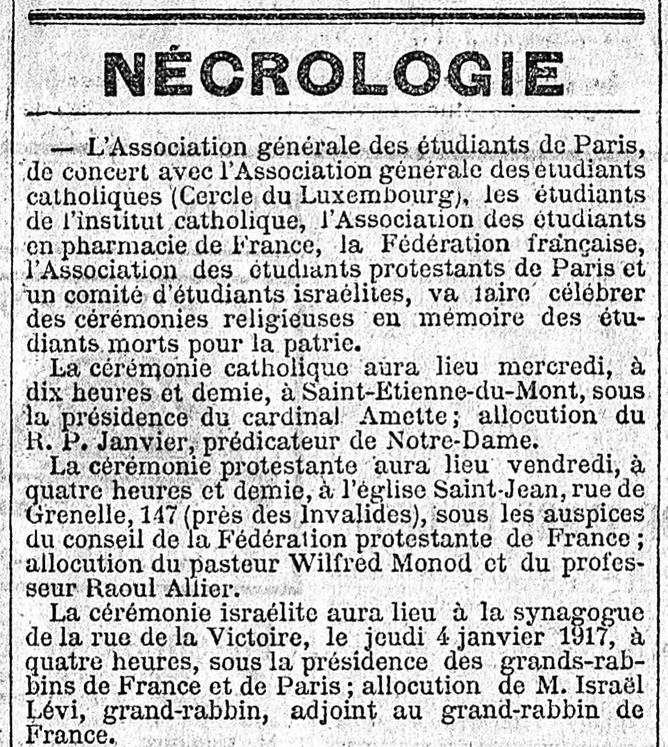 Source: gallica.bnf.fr / Bibliothèque nationale de France.At the end of 1916-beginning of 1917, Catholic, Protestant and Jewish religious ceremonies were organized on the initiative of the Parisian student associations for the students who died in battle.