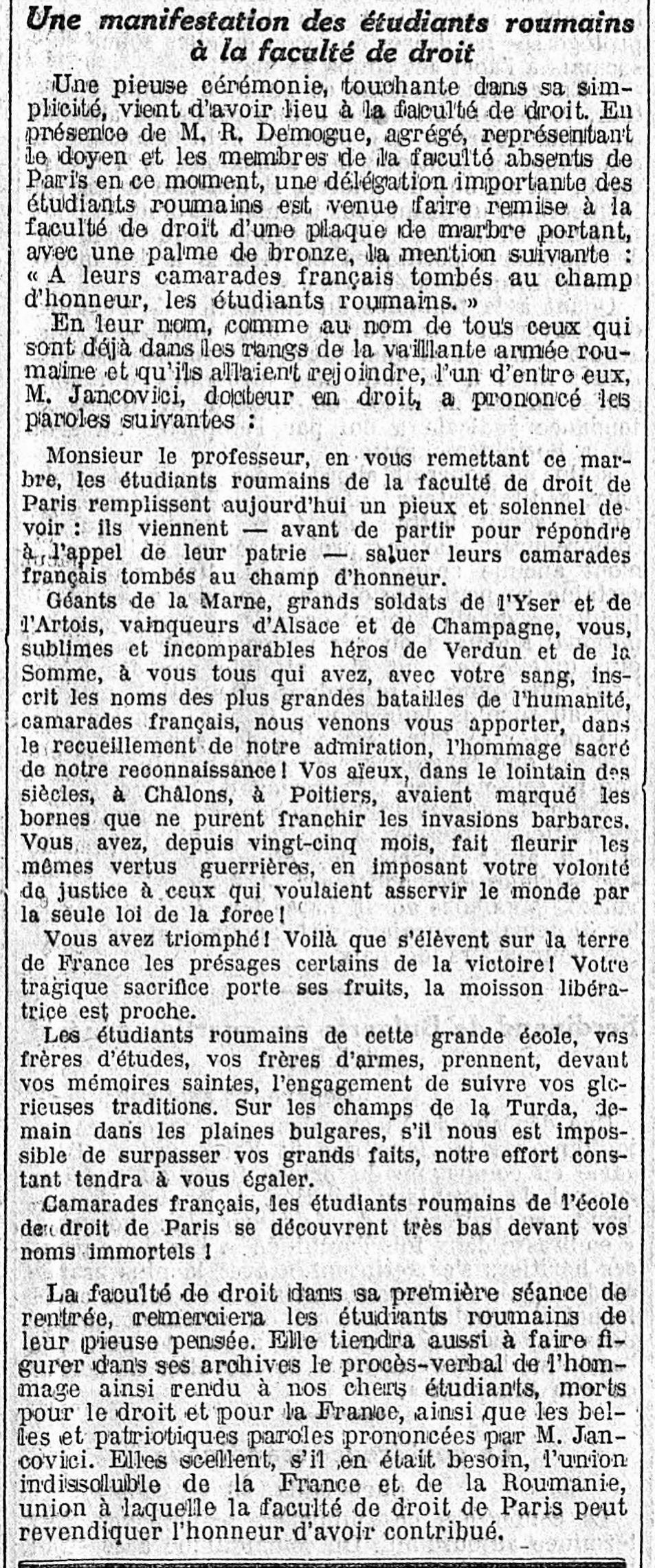 Source: gallica.bnf.fr / Bibliothèque nationale de France.Romania entered the war on the side of the Entente on August 27, 1916 and decreed the general mobilization. The Romanian students of the Paris Faculty of Law were thus called to return to their country to be sent to the front. On September 11, 1916, before their departure, they wanted to present a marble plaque to honor the memory of their French comrades who had died in battle. The article in Le Temps reports the speech given by Jancovici, a doctor of law, at this ceremony.