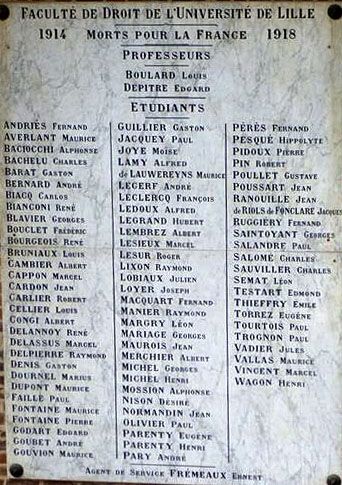 The Lille faculty participates in the work of remembrance of the 'Morts pour la Patrie' (Dead for the Fatherland) by affixing a commemorative plaque on which reside all the professors, students and service agents who disappeared in combat. Louis Boulard, a professor of legal history, appears on the plaque, as well as on the plaques of the Faculty of Law in Paris, where he taught, and on the war memorial in Vannes, his wife's home town.
