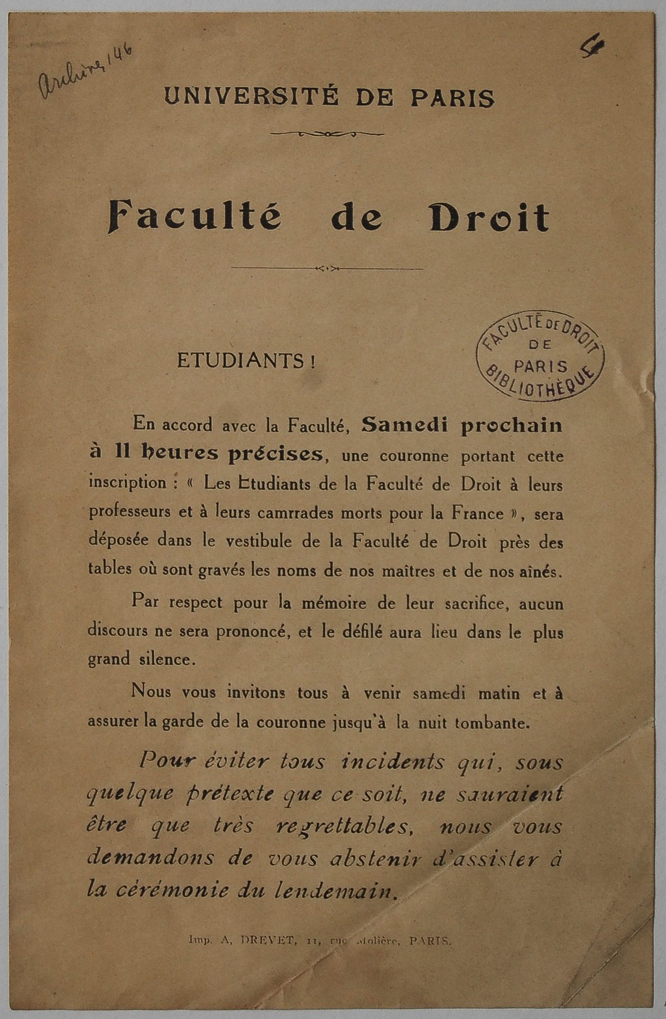 [Flyer for the inauguration ceremony of the war memorial] « Université de Paris - Faculté de Droit - Étudiants ! », March 1925.