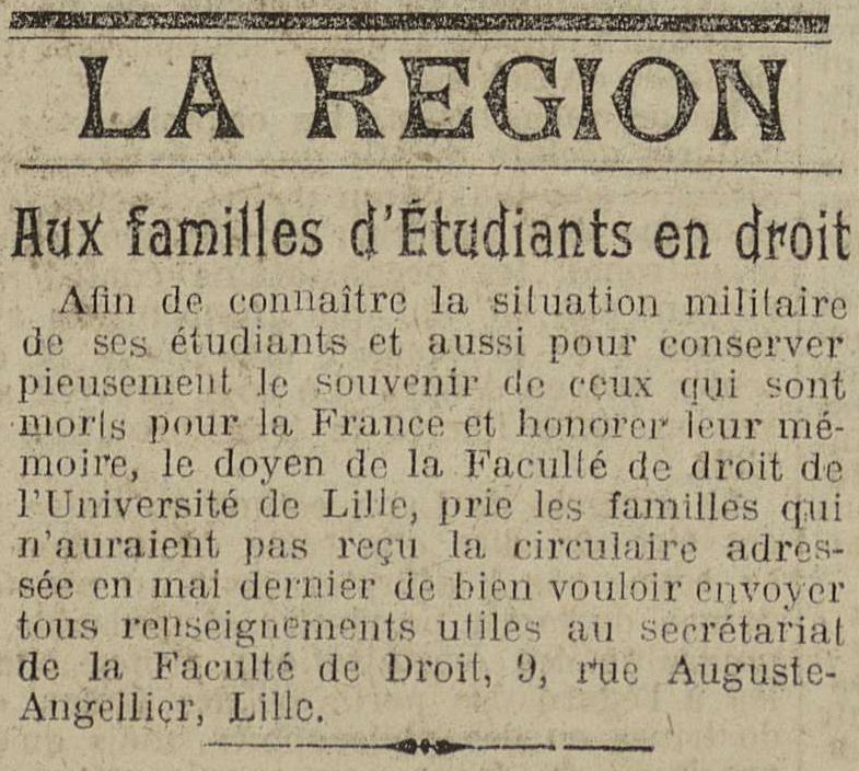 « La région - Aux familles d'étudiants en droit », Le Cri du Nord et des régions libérées, 1st year, n. 57, 22 September 1919.