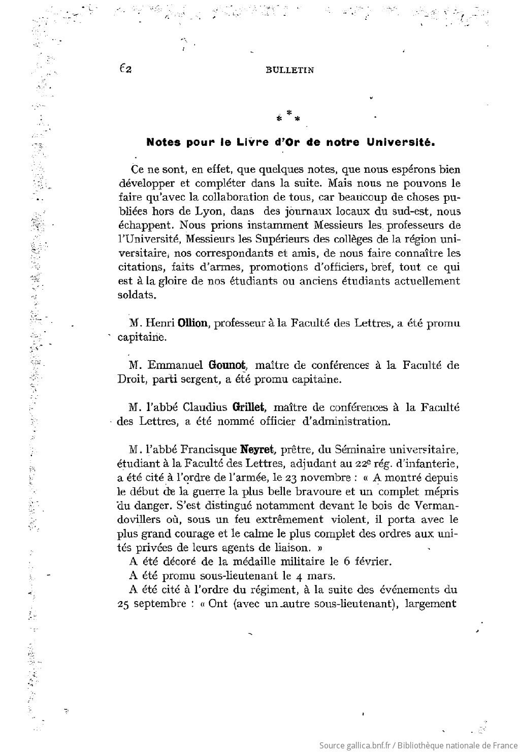 « Notes pour le Livre d’Or de notre Université », Bulletin des facultés catholiques de Lyon, 42th year, no July 1, 1919-June 1920