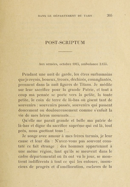 “De l’amas de mes notes, documents, méditations je n’ai dégagé qu’une silhouette, je le vois bien. À mon travail il manque le labeur patient du praticien, qui accuse les reliefs, affine les traits, nuance, polit, met au point ; tâche délicate mais charmante, caresses à son œuvre, doux égoïsme, exquis raffinement dont m’a sevré une existence bien dure et cahotée depuis le deuxième jour de la mobilisation. Je suis sans illusion. Je livre ma thèse telle qu’elle fut écrite en premier jet, dès juillet 1914, avant le drame prodigieux où se jouent à la fois les destinées de cette civilisation gréco-latine qui, depuis près de 3000 ans, émerge au-dessus des pensées humaines, et celles aussi de la Patrie, drame où le monde anxieux reconnaîtra, pour des siècles peut-être, le meilleur génie de l’humanité [From the mass of my notes, documents, and meditations I have drawn only a silhouette, I can see it clearly. My work lacks the patient labor of the practitioner, who accuses the reliefs, refines the features, nuances, polishes, develops; delicate but charming task, caresses his work, sweet egoism, exquisite refinement from which I weaned a very hard and bumpy existence since the second day of the mobilization. I have no illusions. I hand in my thesis as it was written in the first draft, in July 1914, before the prodigious drama in which the destinies of this Greco-Latin civilization, which for nearly 3000 years has emerged above human thoughts, and also those of the Motherland, a tragedy in which the anxious world will recognize, perhaps for centuries, the greatest genius of humanity]” (L. Valatx, Monographie sur le mouvement de la population dans le département du Tarn de 1801 à 1911 [Monograph on the movement of population in the department of Tarn from 1801 to 1911], 1917)