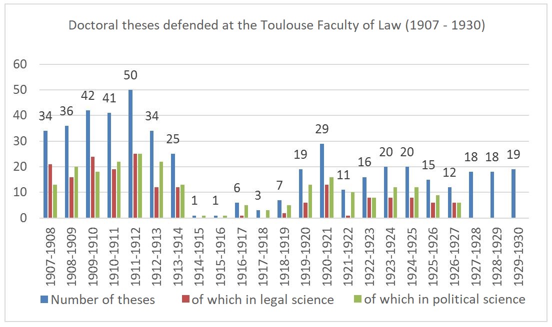 The first effect of the war on the production of theses at the Toulouse Faculty of Law was first observed in the number of theses defended, which decreased drastically in 1914. The pre-war years saw regular defenses for thirty to forty theses, and even though the year 1911, with its 50 theses, marked the beginning of a decline (due both to a change in the conditions for awarding the doctorate in Toulouse in 1911 and a general decline in the number of students in all the faculties of the south affected by competition from Limoges and Clermont-Ferrand from 1909), the two years before the war still saw 34 and 25 doctoral defenses respectively.