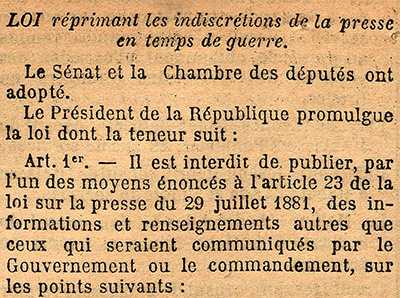 At a time when censorship was insidious (induced by the rules of the market, by the collusion of the political and mediatic worlds, by the lack of plurality of the latter, etc.), we tend to forget its institutional and legal aspect. Its organization during the Great War reminds us of the fundamental character that this last aspect can assume. Indeed, from the first days of August 1914, the government demonstrated its concern to establish a control of information in accordance with the law, and in doing so relied on the law on the state of siege of August 9, 1849. The law vested the military authority with all the powers normally vested in the civilian authority in matters of policing and maintaining order. Among these powers was that of prohibiting publications likely to stimulate or cultivate unrest. As for President of the Council René Viviani, he called on Parliament to vote on some twenty laws, two of which aimed at establishing preventive control of the press. The two texts in question were voted in the climate of the Sacred Union, and therefore without provoking debate. Note in particular that of August 5, 1914 “sur les indiscrétions de la presse en temps de guerre [on the indiscretions of the press in time of war]”, to which we will return later.