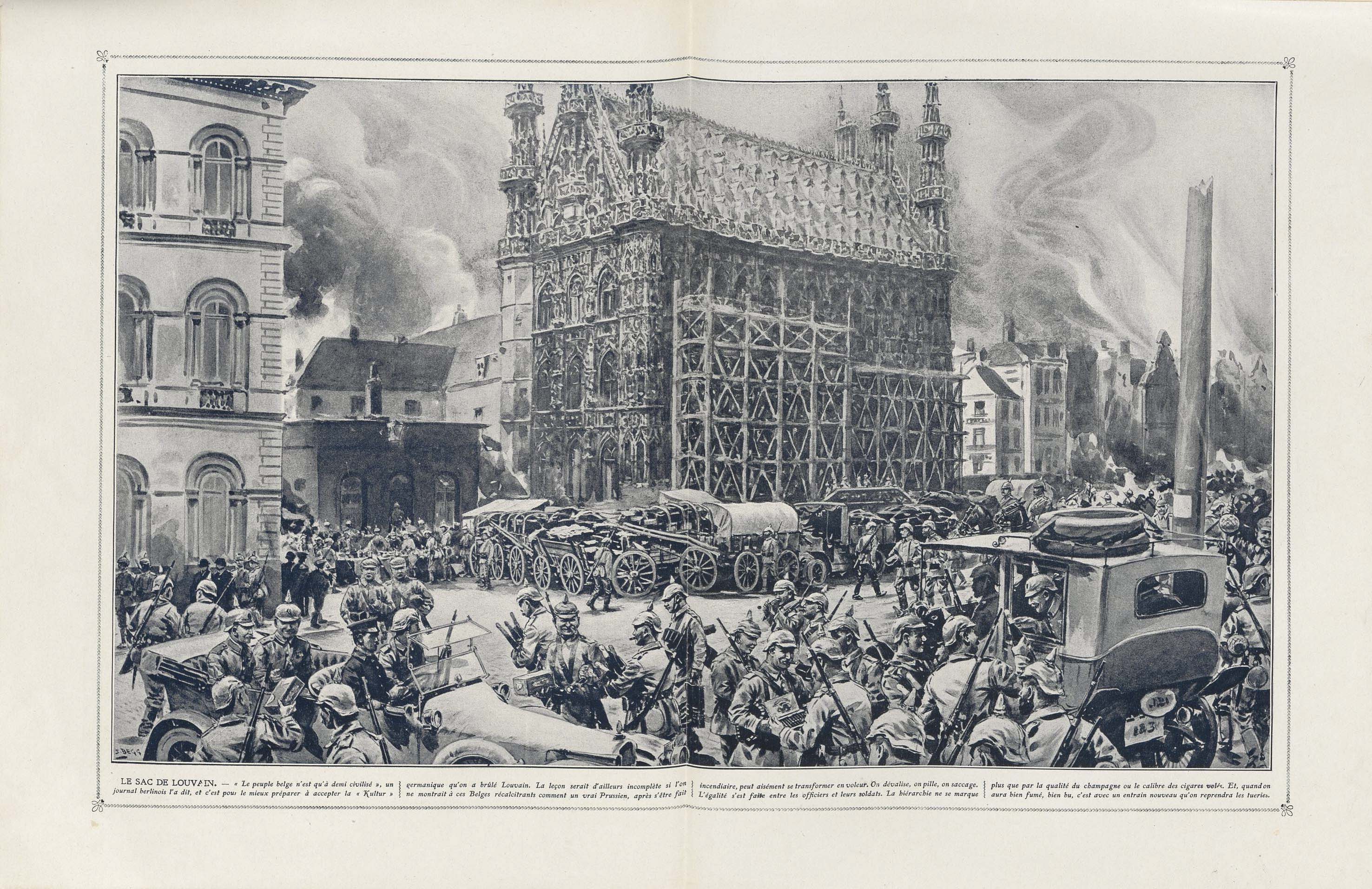 Source gallica.bnf.fr / Bibliothèque nationale de France.Le « sac de Louvain » en Belgique commence le 27 août 1914 et dure huit jours. A cette occasion, l’armée allemande incendie et pille la ville. Outre les nombreuses victimes humaines, la destruction de la bibliothèque pluriséculaire de l’université frappe les esprits. Les informations sur les exactions commises et les images qui circulent dans la presse suscitent une vague d’indignation dans le monde entier, auprès des populations en général, mais particulièrement auprès des universitaires et des juristes pour qui le sac concrétise la trahison de leurs confrères allemands.