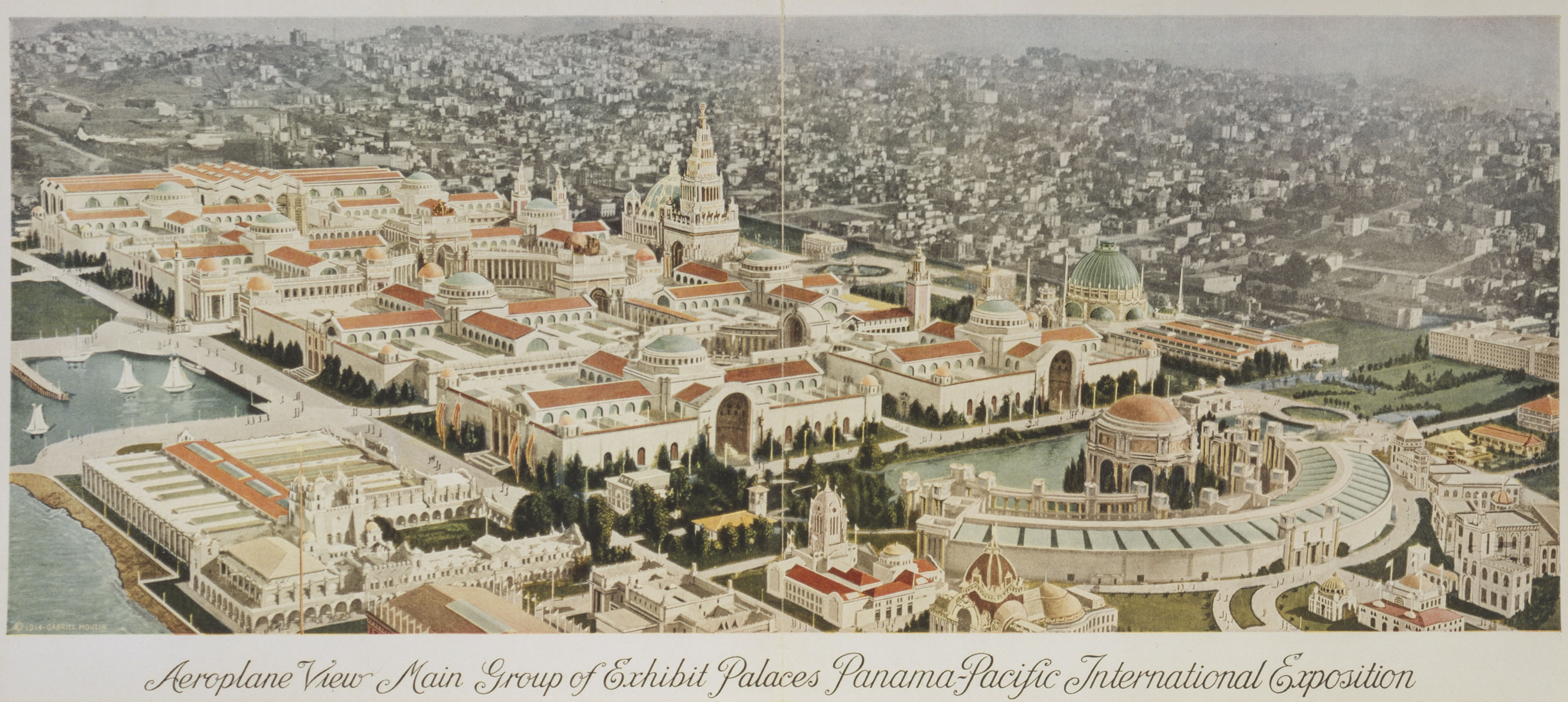 « Aeroplane view main group of exhibit palaces Panama-Pacific International Exposition », Gabriel Moulin, Views of the Panama-Pacific International Exposition in natural colors, San Francisco : Published by Pacific Novelty Co., c1914.